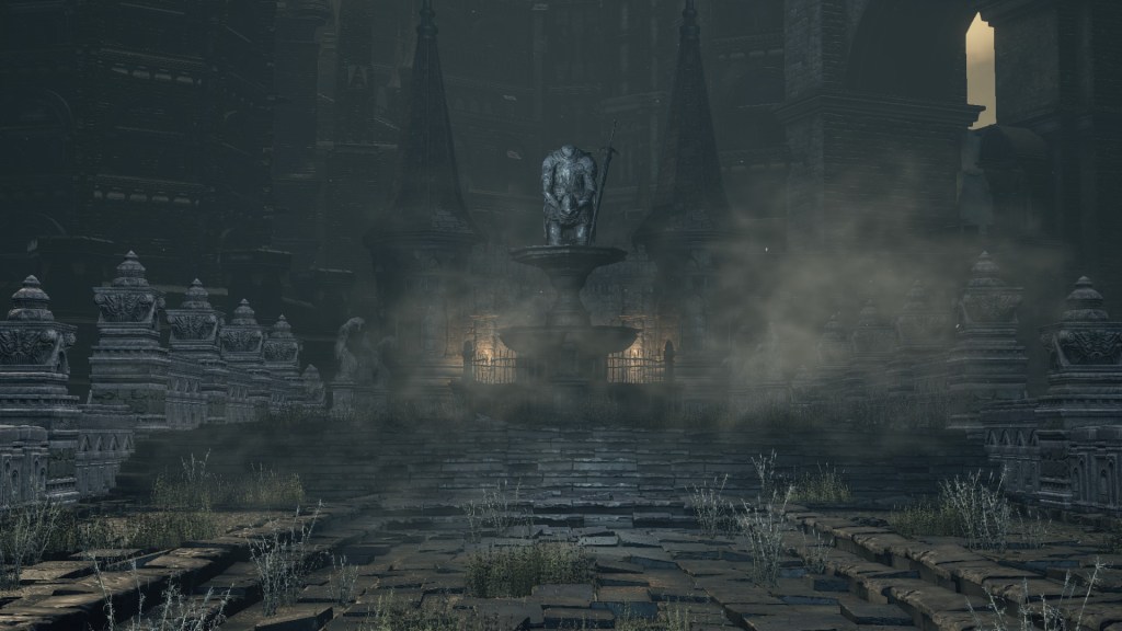 But in spite of the added cultural pressure, Lothric has maintained its unique spiritual identity, especially within the military. The church’s altar enshrines a knight severing his own head. The statue is part of a ceremony for knights taking the oath of fealty. The initiate takes the basin held by the High Priestess and places it on the altar, which activates a mechanism for the effigy to finish the cut and spill “blood” into the bowl before opening passage to the castle. This old custom is a mere shell of itself, so the rite likely required the initiate spill his own blood to prove his dedication originally — unsurprisingly, the tradition was scaled back. Regardless, the knights essentially swore to faithfully serve to the point of self-sacrifice, hence other statues of them holding their severed heads. This is why their armor’s description claims that only those with a knight’s resolve will wear it, for they may be asked to become steeds or offer themselves to flame.