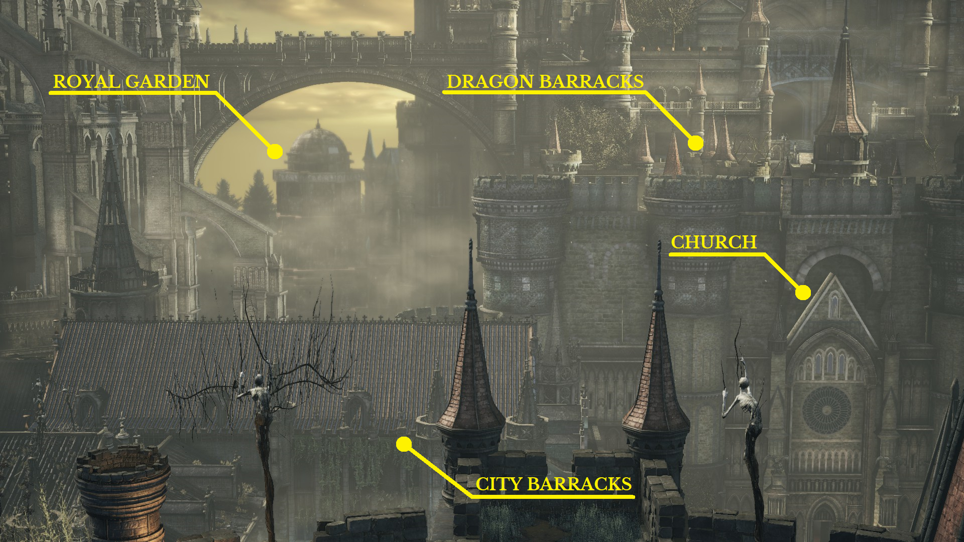 Lothric warriors comprise the dead meditating toward Archdragon Peak from Irithyll Dungeon. The temple evidently shared the secrets to reach it and become dragons with the kingdom, which we can date to their initial collaboration. The Drakeblood Knight performing the meditation in the royal garden ruins indicates that he learned it from some inscription or other means there, likely his motivation for infiltrating this sanctum to begin with. Moreover, tattered royal banners are laid out on the wyvern altar or hang in the second temple, implying that the army were longtime regular visitors — not just to learn from the firstborn directly, but to also become wyverns and, occasionally, try becoming archdragons. In that case, Lothric knights and soldiers must be the wyverns’ true identities, their varying scale colors reflecting how the different ancient flyers appeared in their youth. Indeed, the original description for the Knight’s Ring only mentions them becoming a friend to dragons, not necessarily “rearing” them like the localization suggests — Lothric’s two symbols are one and the same.