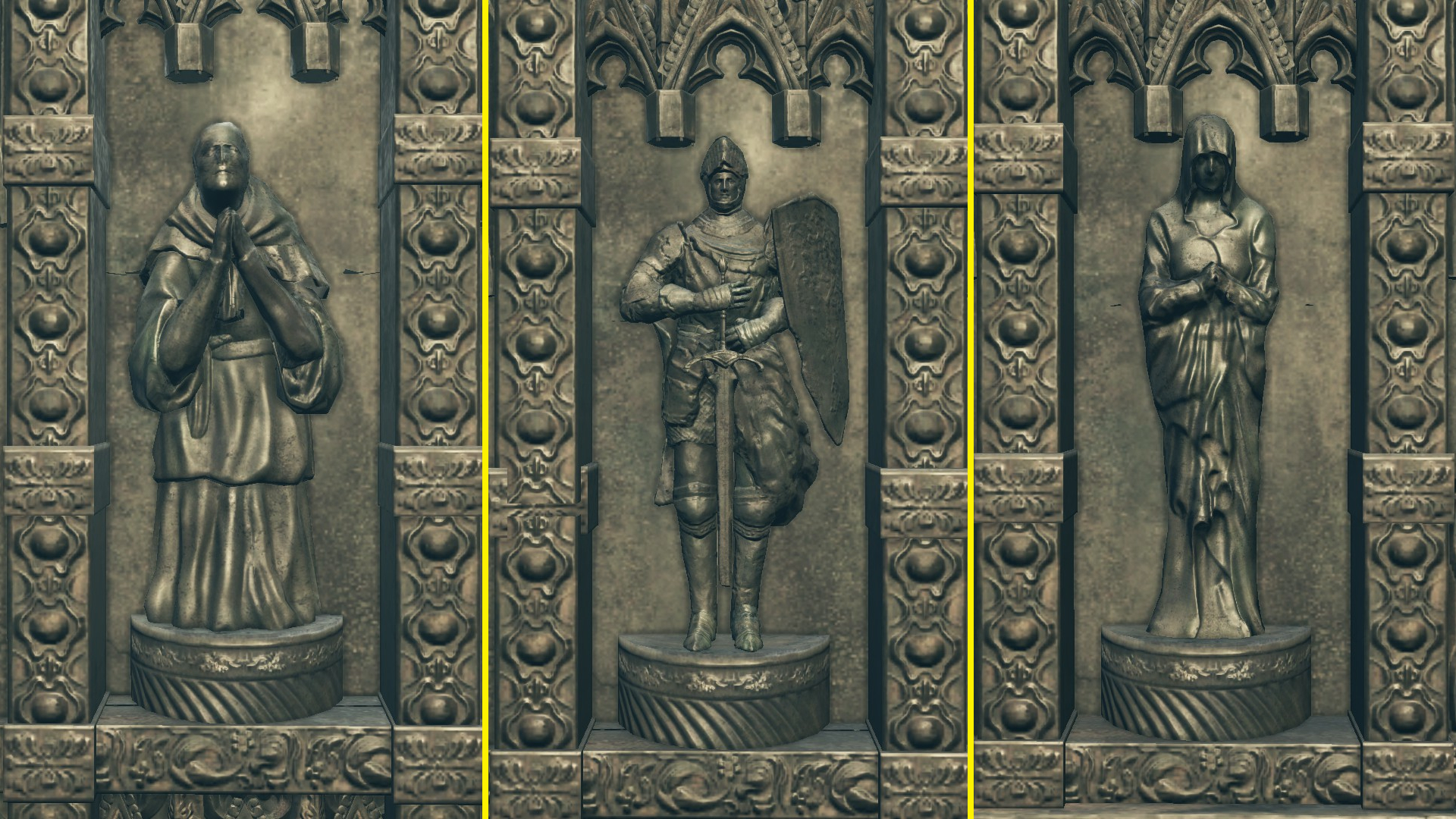 Whenever a new prince of Lothric is born, a High Priestess is assigned as his wet nurse, their ring depicting the elder swaddling an infant. This makes her the one primarily raising him — which allows the Pillar to shape every potential heir to the throne to their liking, impressing piety on top of teaching his more secular royal duties. This is the reason that we can readily access Prince Lothric’s bedroom via a chapel lift, pews arranged as if to worship to those coming to and from; the room is furnished to accommodate large gatherings, banners with the royal crest hanging overhead. Moreover, the metal doors to the prince’s chambers feature reliefs of a priest, a knight, and a High Priestess. The latter was as much the voice behind the king as a Pillar supporting him. However, they were not without aid in this holy mission. For even ignoring the figure sandwiched between the clergy, the doors still give way to a hall flanked by knight statues.