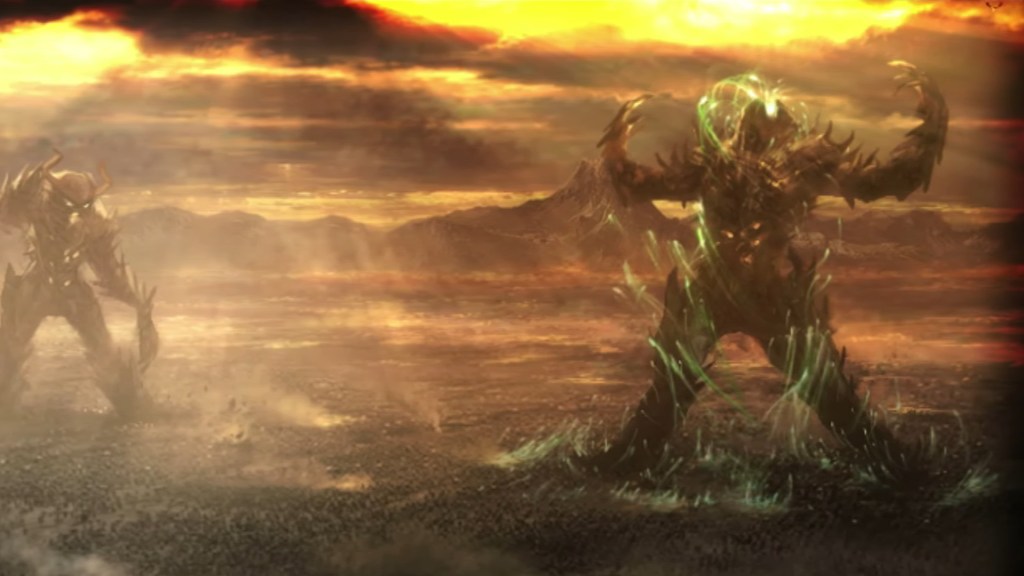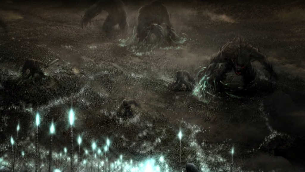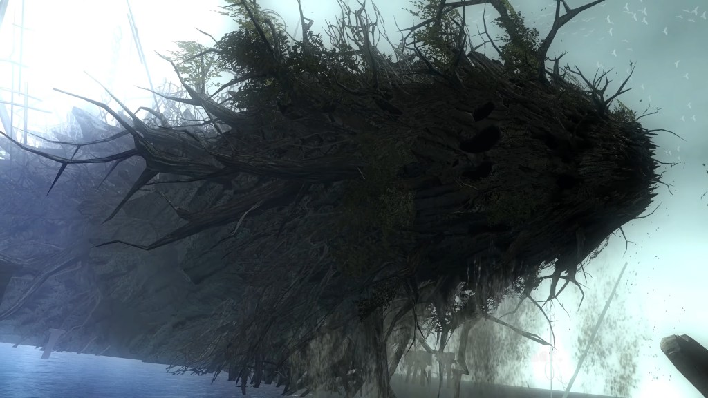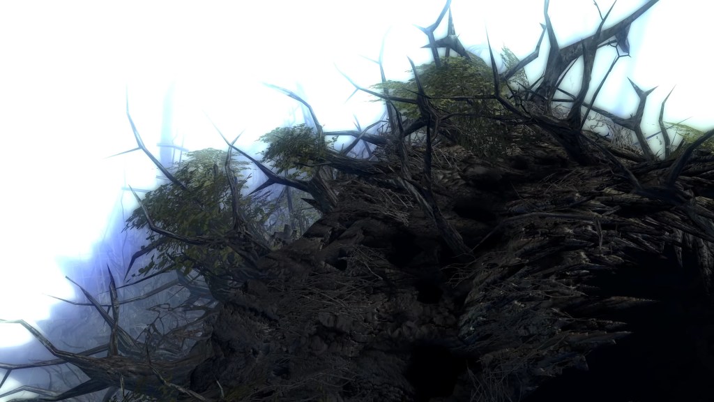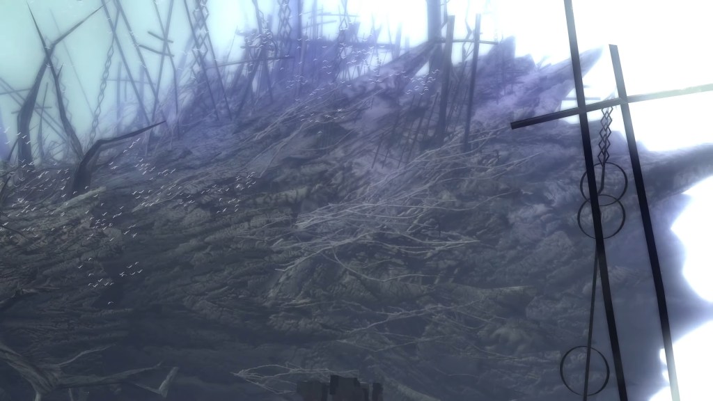 This “ancient beast” (古い獣) is the original demon placed upon the Earth, from which all other demons are born. Taking obvious inspiration from the ancient outer gods in the works of H.P. Lovecraft, the Old One looks like a nondescript abomination. Its gargantuan form is seemingly comprised of actual trees, rocks, and earth, twisted around solely to form a gaping “mouth” with which we enter like a cave. The birds flying alongside the beast imply that they nest within these trees, so it may well be that this body is actually parts of the land where it was first left and largely slept. In other words, this arboreal body may not in itself be the Old One. We find its soul enwreathed by the trees at the back of its proverbial throat, so it is possible that this “core” coalescing the soul is the actual demon and everything else was just made to protect it, similar to the Phalanx boss. If so, then it is understandable why no one even suggests slaying the monster; there is nothing tangible to kill. Indeed, both the cinematic and King Allant’s Japanese dialogue only describe the Old One as a poison, with doku (毒) having a lesser used meaning of “malice” — a different kind of thing which is harmful to man, but appropriate nonetheless.