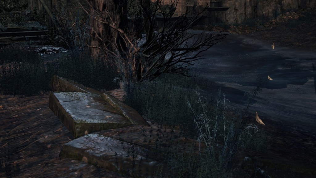 The Consumed King’s isolated garden is still overrun with the pus by the time we arrive to the scene, a peculiar toxic swamp dotting the landscape. Unlike the one in Farron Keep, this bog is incredibly shallow, though what lies beneath the layer of fluid looks like an almost frozen white, muddy material. Rotten slugs also inhabit this swamp, apparently swallowing dark gems as they loiter in the fluid. While their presence isn’t unimaginable for a forest garden, cut content reveals that these unassuming mollusks were originally supposed to be a dense “lump of Hollows” (亡者団子) in a slimy, gelatinous form, almost like pus. And with the Dark occasionally manifesting as a poison, we can be certain that this swamp stems from the pus of man roaming the area uninhibited. Furthermore, close inspection of the surrounding forest reveals the same grass associated with stagnation springing up all around, and two of these pus snakes has dendrified at the Lothric portion of the Dreg Heap.
