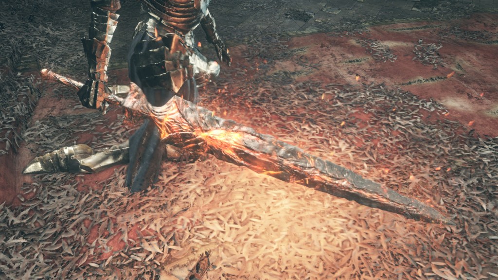 It is said that, before receiving his younger brother’s curse, the knight Lorian single-handedly killed the Demon Prince and that this greatsword has been continually burned in flame ever since.