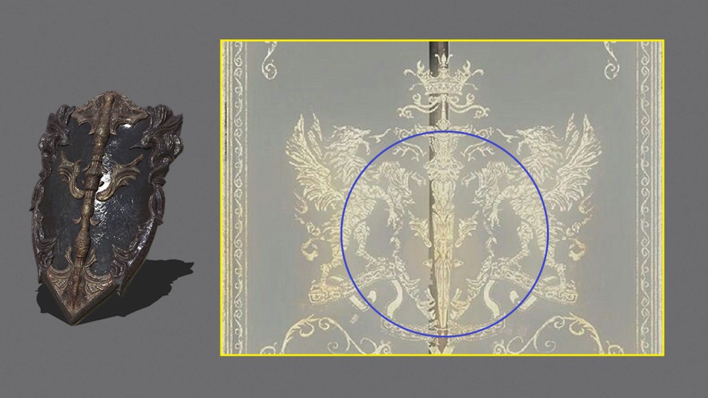 To complement these abilities, a straight sword was forged and blessed to contain comparable holy magic. This manifests in the the blade’s skill, unleashing sacred light named for its intended wielder. Such power is probably the reason that the sword is platinum, literally “white metal”, (白金) much like how Anor Londo infused holy magic to create white iron in the original Dark Souls. Regardless, it was an armament worthy of the future Holy King of Kindling. Indeed, the holy sword was forged expressly for his mission, according to its description. Its design was also clearly based on the sword emblazoned at the center of the kingdom’s coat of arms. Once he grew old and healthy enough to wield the faith-dependent blade, the prince would represent his namesake with all the strength only a sanctified servant of the gods could muster.