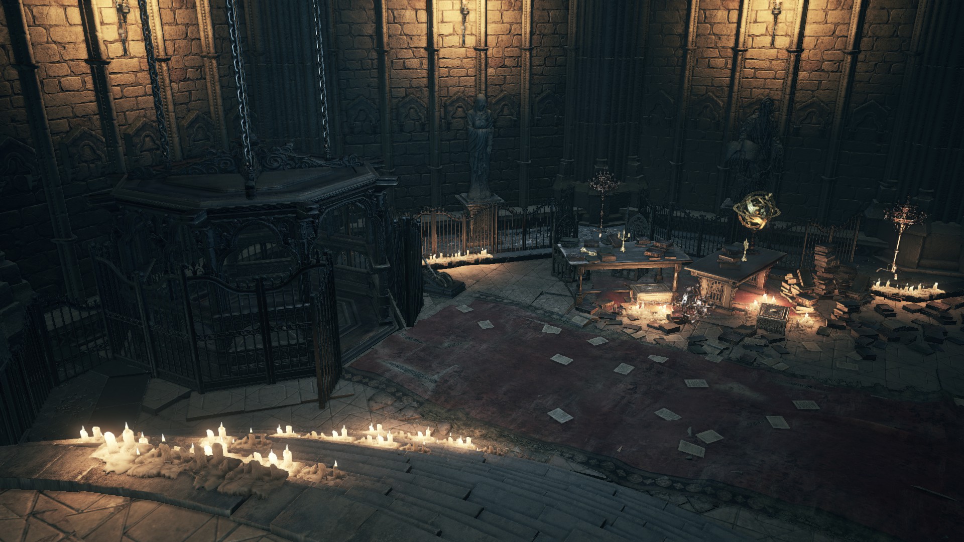 In this manner, the boy was raised by the priesthood, hence why his chamber is readily accessed from a lift in the castle’s chapel. All of the clergy probably prayed for the prince’s recovery while also teaching him his sacred duty and miracles; the offensive variety of yellowish white magic seen during his boss battle would be especially useful for facing the Lords’ avatar. At the same time, he likely invented the spells himself following comparable instruction from the scholars. Several of the arts bear similarity to soul sorcery — in one instance, applying the principles of Crystal Soul Spear — and the Grand Archives does have a private study at the other end of the bridge to the prince’s chamber, complete with a lift for royals and priests alike to skip the rest of the library should they choose to observe. Lothric definitely had the talent considering the great holy power inherited from his mother, as evidenced by him casting miracles without the aid of a catalyst. And in either case, he undoubtedly excelled in both scholarship and scripture.
