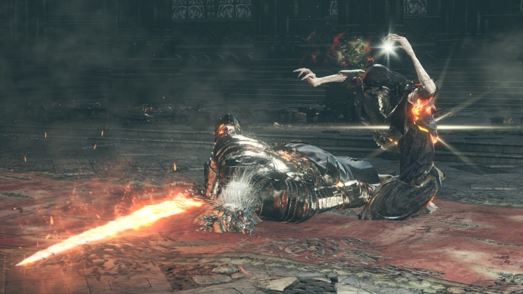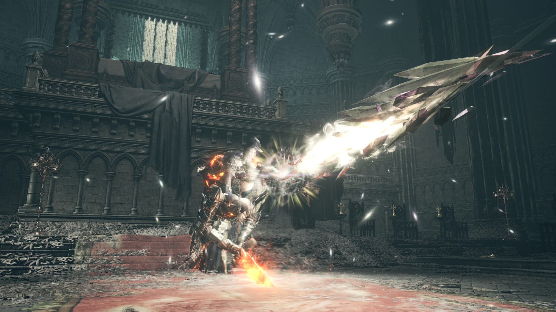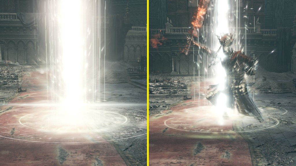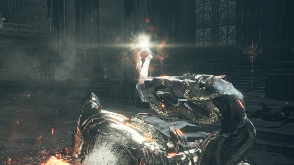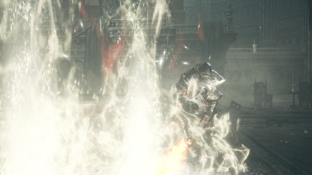 After we first defeat Lorian, Lothric teleports over to revive his other half through their curse, a magic white light enveloping the older prince’s body upon contact. Only then, as both live, do their bodies manifest heat. For the rest of the battle, the younger prince remains hanging on the elder’s back, contributing his spells plus his own holy power for Lorian’s sword slam. Although this exposes himself to vulnerability, it is likely by necessity. Lothric’s body harbors both their souls, so the proximity is what would allow Lorian to maintain control over his own regardless of damage — and we do first see the zombie drag his crumpled form out of a corner by his sibling’s bed, as if left inert to be repossessed when required. Because of this, the younger sibling can also restore the link between elder’s body and soul whenever the knight is slain, though with diminishing results; each subsequent attempt, Lothric’s prayer to force the resurrection causes a backlash resembling Wrath of the Gods while the Lorian’s HP is restored less and less. But this is only a problem if Lorian dies. Ideally, he never would.