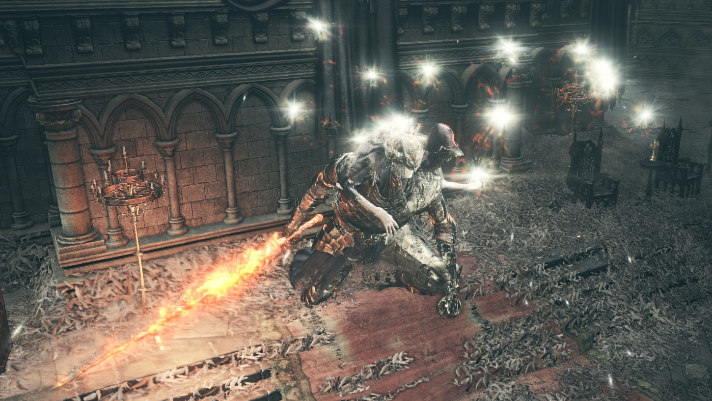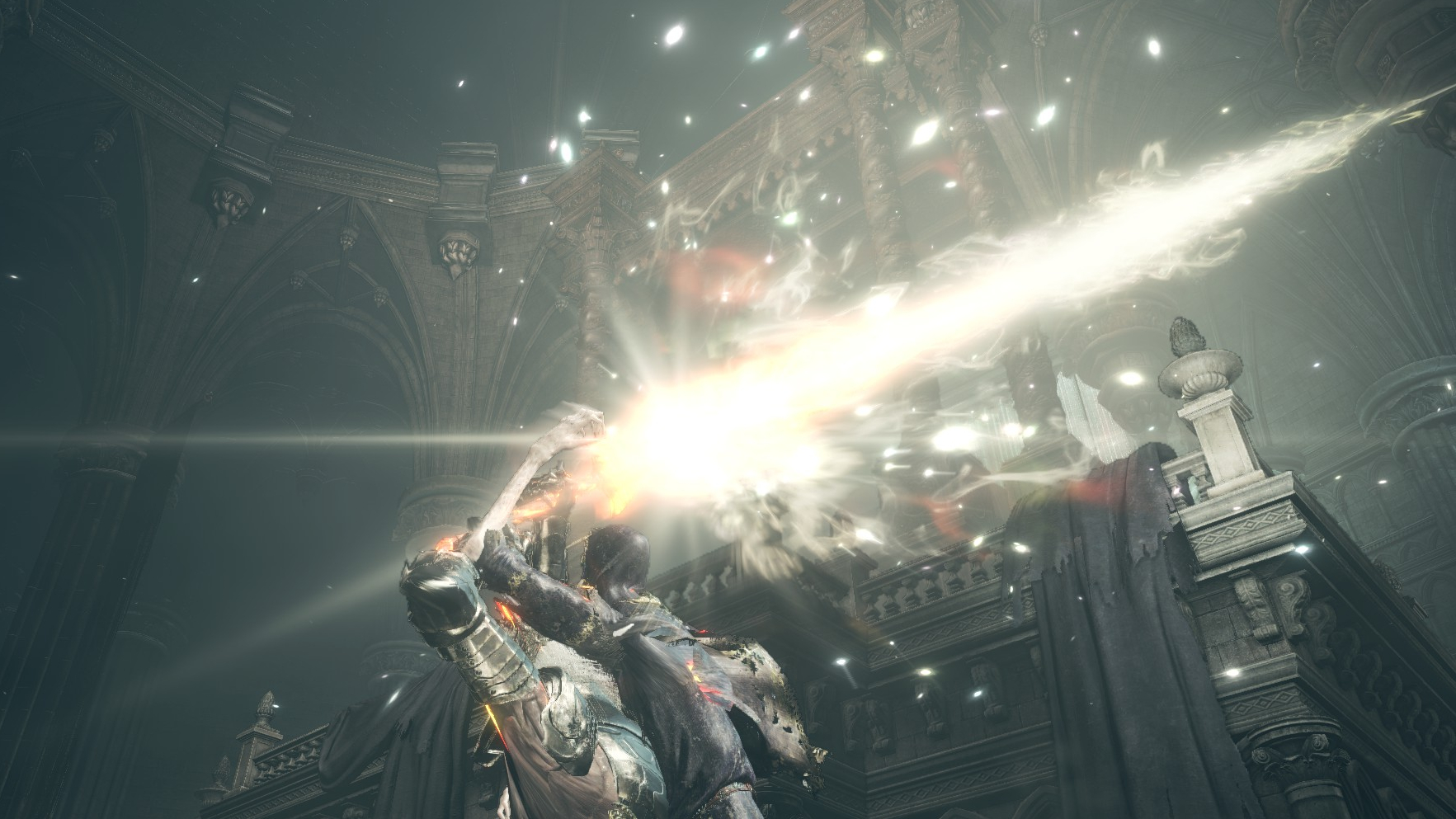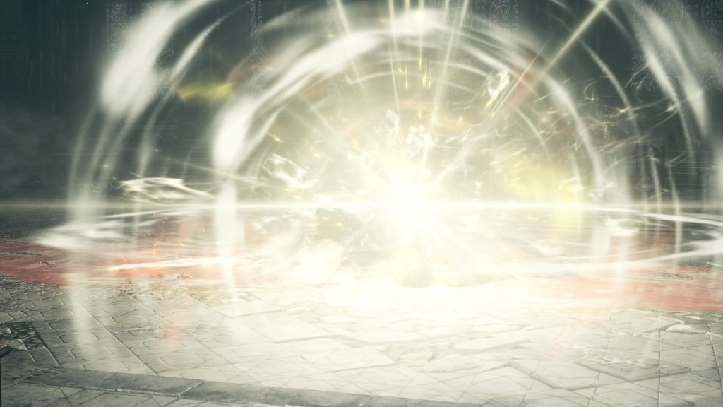 After we first defeat Lorian, Lothric teleports over to revive his other half through their curse, a magic white light enveloping the older prince’s body upon contact. Only then, as both live, do their bodies manifest heat. For the rest of the battle, the younger prince remains hanging on the elder’s back, contributing his spells plus his own holy power for Lorian’s sword slam. Although this exposes himself to vulnerability, it is likely by necessity. Lothric’s body harbors both their souls, so the proximity is what would allow Lorian to maintain control over his own regardless of damage — and we do first see the zombie drag his crumpled form out of a corner by his sibling’s bed, as if left inert to be repossessed when required. Because of this, the younger sibling can also restore the link between elder’s body and soul whenever the knight is slain, though with diminishing results; each subsequent attempt, Lothric’s prayer to force the resurrection causes a backlash resembling Wrath of the Gods while the Lorian’s HP is restored less and less. But this is only a problem if Lorian dies. Ideally, he never would.