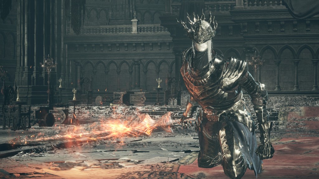 Despite Prince Lothric never actually linking the fire, his remains contain flame comparable to that of a genuine Lord of Cinder — even the victory text upon the bosses’ defeat refers to them as one. This qualification is definitely thanks to Lorian and not the Demon Prince he ran through with his greatsword. While the man does expertly wield the demon’s flame retained by his melted, burning blade, the knight prince’s spirit looks no different from the standard boss soul. Lorian himself doesn’t manifest power of any fire demon, so his and his brother’s heat has likely combined to make them bear more heat than your standard fire-inheriting boss. Their bound souls are, together, more impressive than even a Lord of Cinder, and both reside in Prince Lothric’s body, explaining why Lorian looks ghostly pale — no soul, no blood flow; loss of vitality similarly explains the bleached hair. And unlike the Lords, who draw upon their piece of the First Flame when placed on the back foot, the Twin Princes only become embered once Lothric enters incredibly close proximity to Lorian.