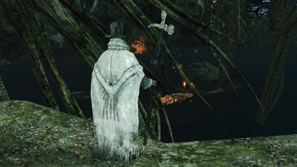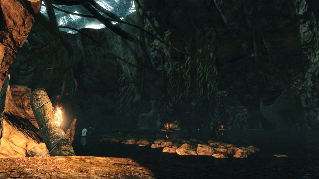 One can argue that the songstress in the farthest hut was captured as a tool to more easily hunt Hollows in the area. Amana’s grotesque Undead adapted to sneaking through the water are dangerous, especially in groups; a number loitering in the corner of a cavern filled with human bones, pacified thanks to a random swarm of Brightbugs. The chest with twinkling titanite left in that recess, combined with another storing a dragon charm next to the cave entrance closer to a hut, suggest that this was the fate of one poor hunting party, so the tribe would benefit from a voice that can control the bugs. Catching the passive Milfanito is no issue either. Despite being Hollows themselves, neither priestess nor pilgrim is pacified by the Milfanito’s singing, likely owing to a strong and lasting presence of mind. Just as their hostility to our trespass is likely not an instinctual hunger for souls but desire to offer our flesh to the demon, their resistance to her siren song was probably also thanks to pagan devotion. Rather, the problem lies with why they plan to soon offer one up to their demon in spite of the benefits.