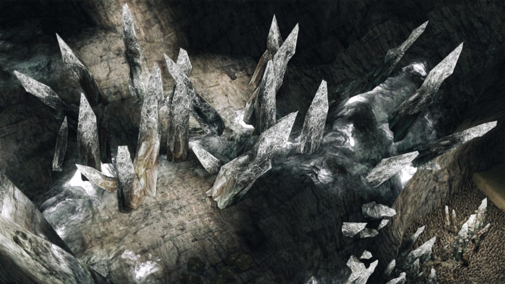 Put simply, Olaphis used the knowledge Anor Londo’s duke accumulated as a roadmap for their own advancements. It seems that the country even sought out more places connected to Seath to further their understanding of sorcery. Deep in Drangleic’s mountains far to the east of the Lost Bastille lies the land of Tseldora with its vast deposits of brightstone. Aside from being an obvious reference to the magical “augites” (輝石) of Demon’s Souls, the glowing white crystals also bring to mind twinkling titanite and magic crystals associated with Seath. The description for the Tseldora robe does imply them to be fragments of the paledrake, meaning that they are most likely his artificial crystals infused with the magic power of souls — perhaps vestiges of the Crystal Cave the duke created in the garden behind his archives. And Olaphis had undoubtedly been mining these crystals.