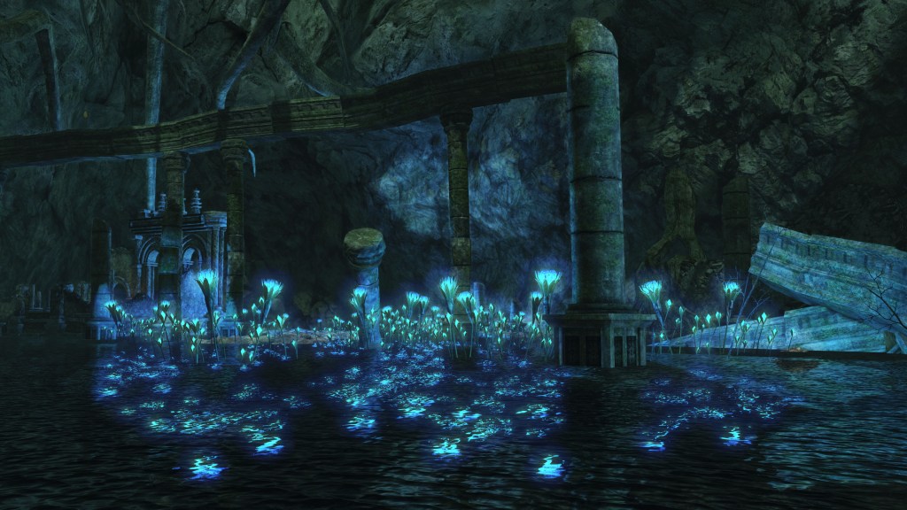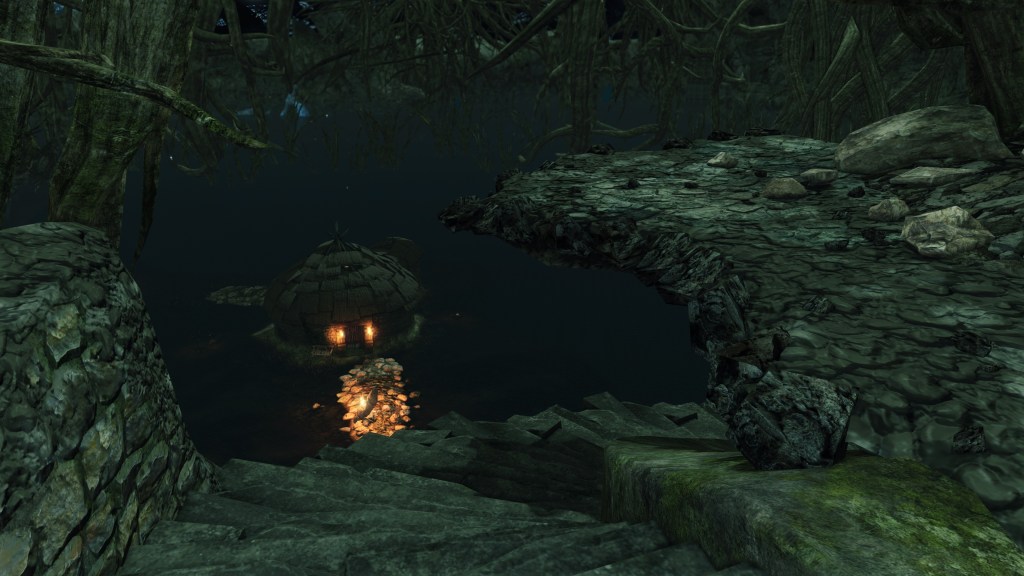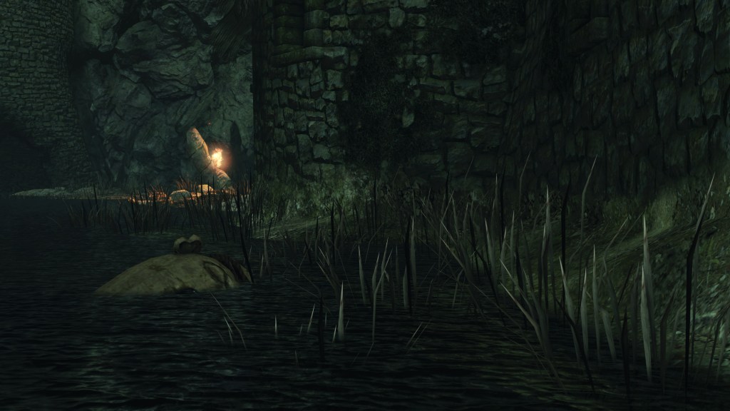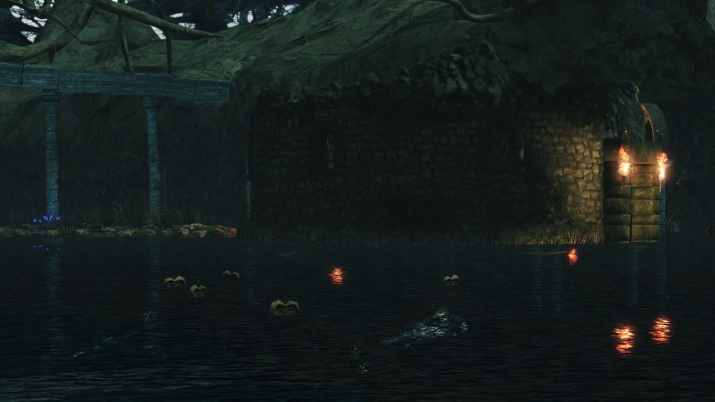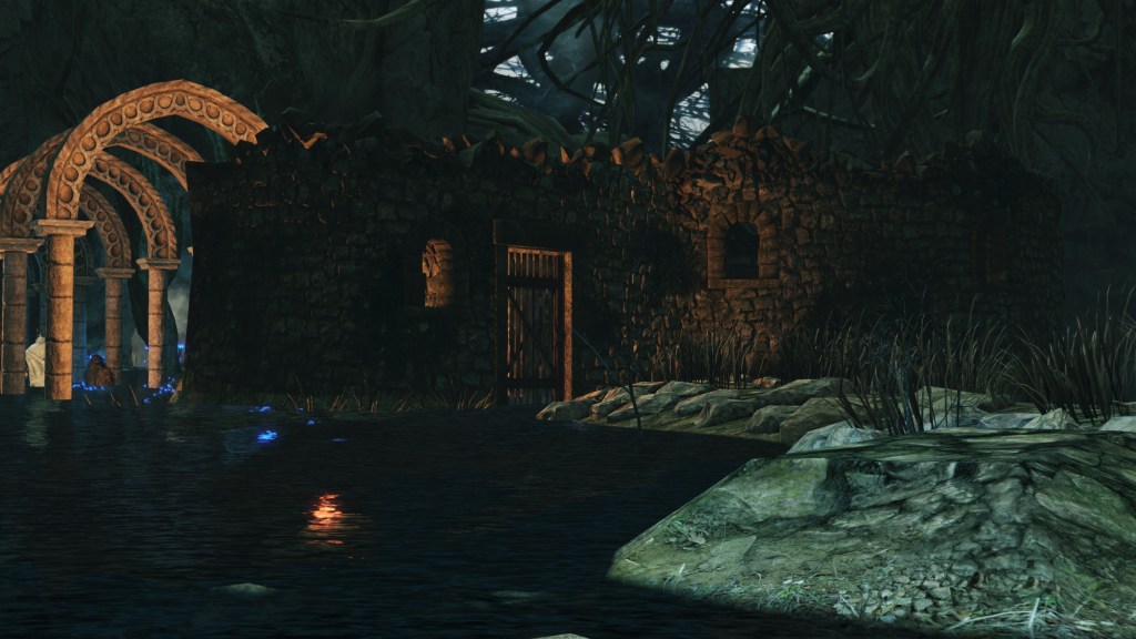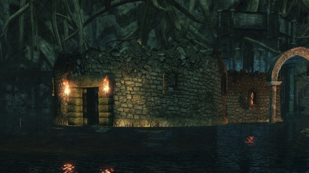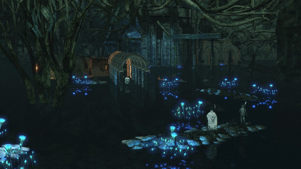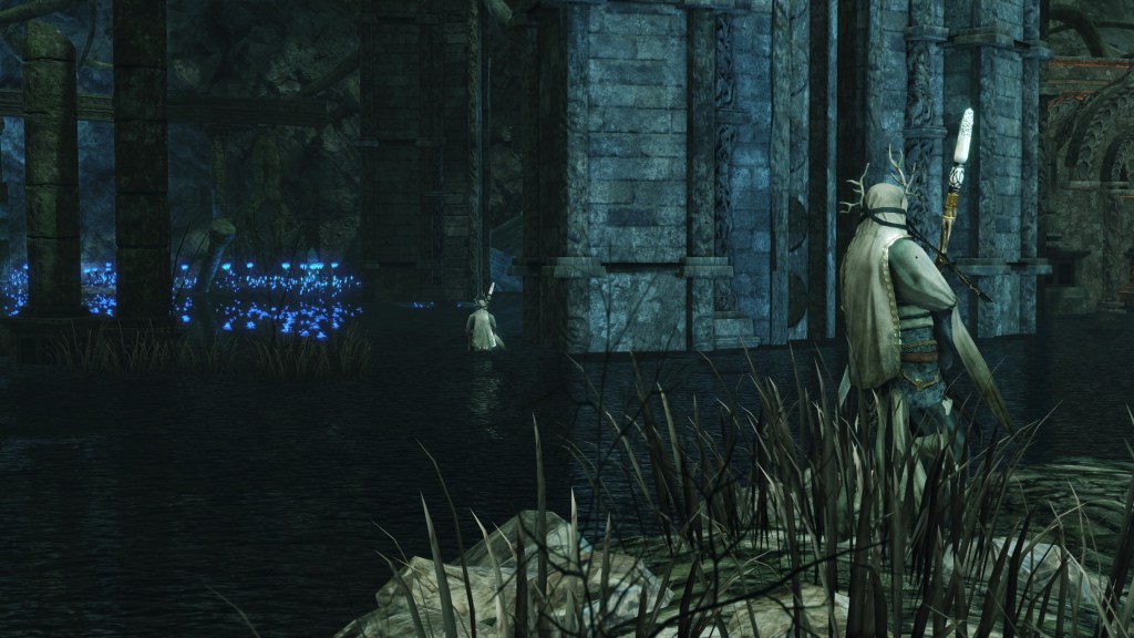 The Shrine of Amana is a curious area. Amana (甘菜) is a species of tulip known for its sweet and edible bulbs, so the land may be named for the bulbous, glowing blue flowers beautifully flourishing in parts of there. But regardless of the name’s origin, the ruins have been resettled since Heide’s destruction, stone huts with thatch roofs interspersed amongst the architectural wreckage. Aside from the simpler construction and dissimilar styles, only one of these shanties has succumbed to the elements, joining the rest of the flooded ruins in clearly more recent times. Some of the old Heiden rubble has even been propped up to improvise torches, including within the huts. This leaves no doubt to people living down there, the inhabitants likely among the various Hollows we encounter.