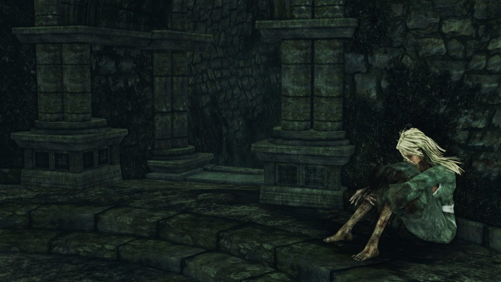 Maybe the women had always relied on this practice. Otherwise, they may have only resorted to it after losing the magical sealing ritual, a desperate attempt to keep the beast under their control before it actually broke free. Indeed, these events mirror classic Japanese tales of evil spirits being sealed away in shrine altars and subsequently deified, often appeased with human sacrifices after the fearful locals lost the abilities of the original sealers. Whatever the case, the remaining Hollows still haven’t abandoned the practice. We can find a helpless Milfanito sitting around in the first hut, another in much worse condition in the last hut leading into the Demon of Song’s lair. The fact that we can “save” that raggedy one just outside the boss room, much to her identical twins’ gratitude, affirms that they are being captured for new sacrifices, with the help of the Archdrake Sect pilgrims.