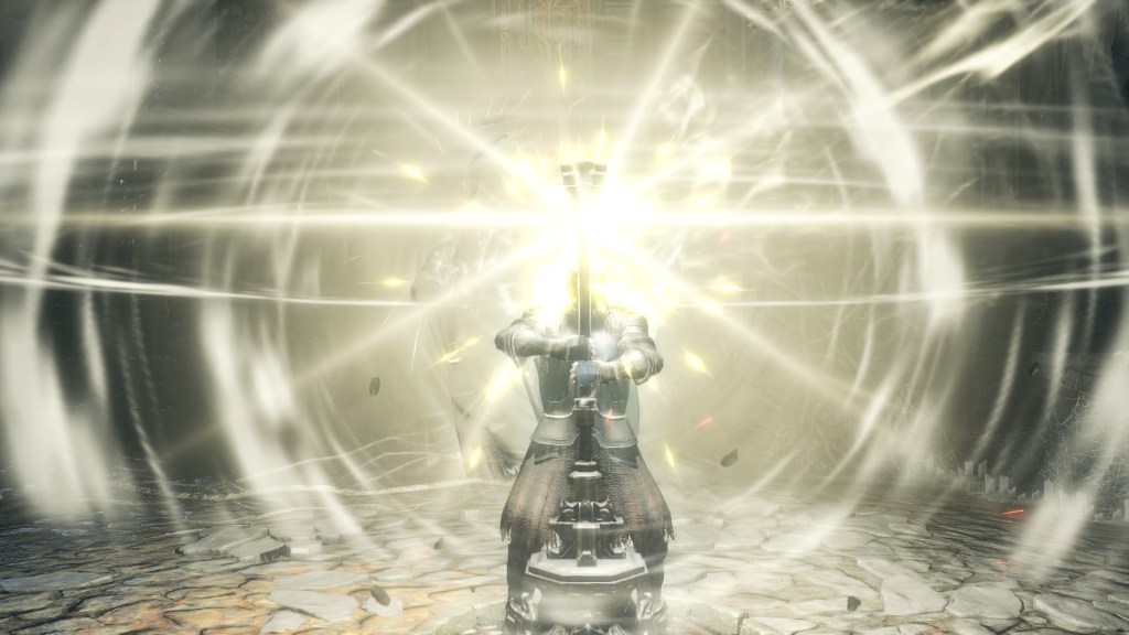 This isn’t to say that the church no longer encourages sincerity from its congregants, especially clergy. Miracle talismans almost universally possess the ability to make a “Firm Prayer”. (断固たる祈り) This skill has the wielder gather a firmness of their resolve and, by extension, body. That thereby allows them to not be interrupted when chanting scripture to perform the miracle, come what may. Cleric weapons with the Perseverance skill likewise perform a “firm prayer” when assuming their stance for similar effect. Great Heal and its weaker derivatives also manifest a new area of effect, rewarding the faithful with benefiting their community — someone with merely Heal Aid can never be thanked for that. All in all, followers of Anor Londo religion show a more consistent level of credence in divine power; it is simply easier for ye of little faith to see the benefits of deepening their trust in those mysteries. And with no more Thorolund Talisman to cheat the system, clergy at all levels are more liable to practice what they preach.