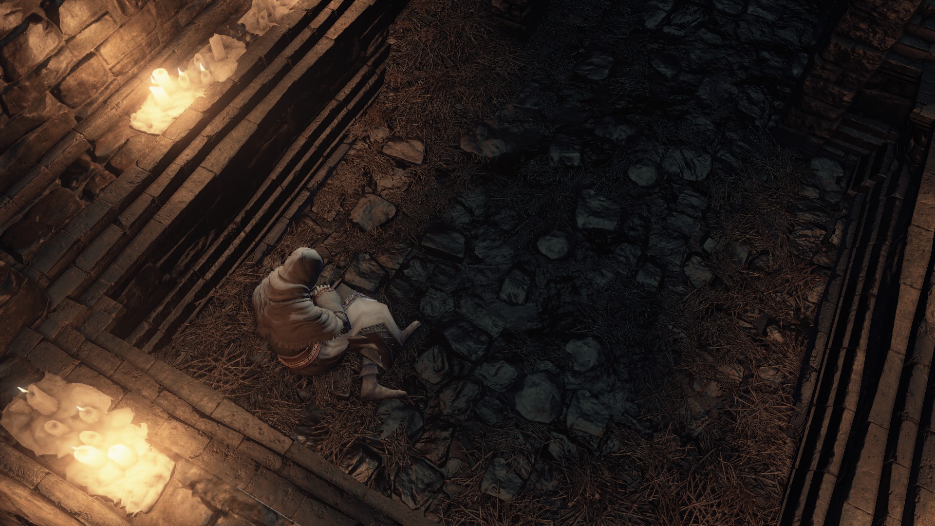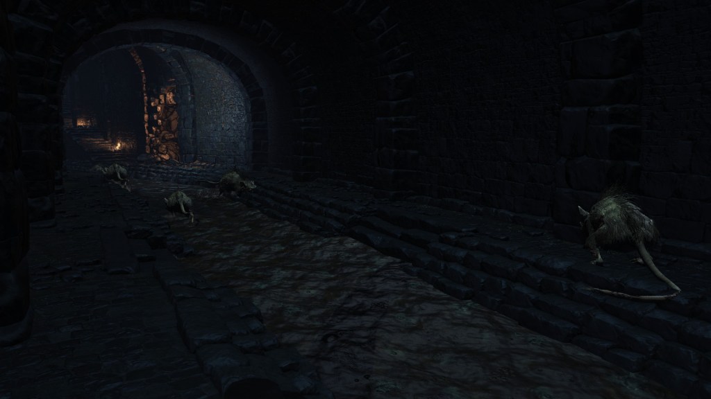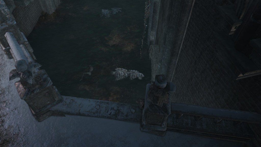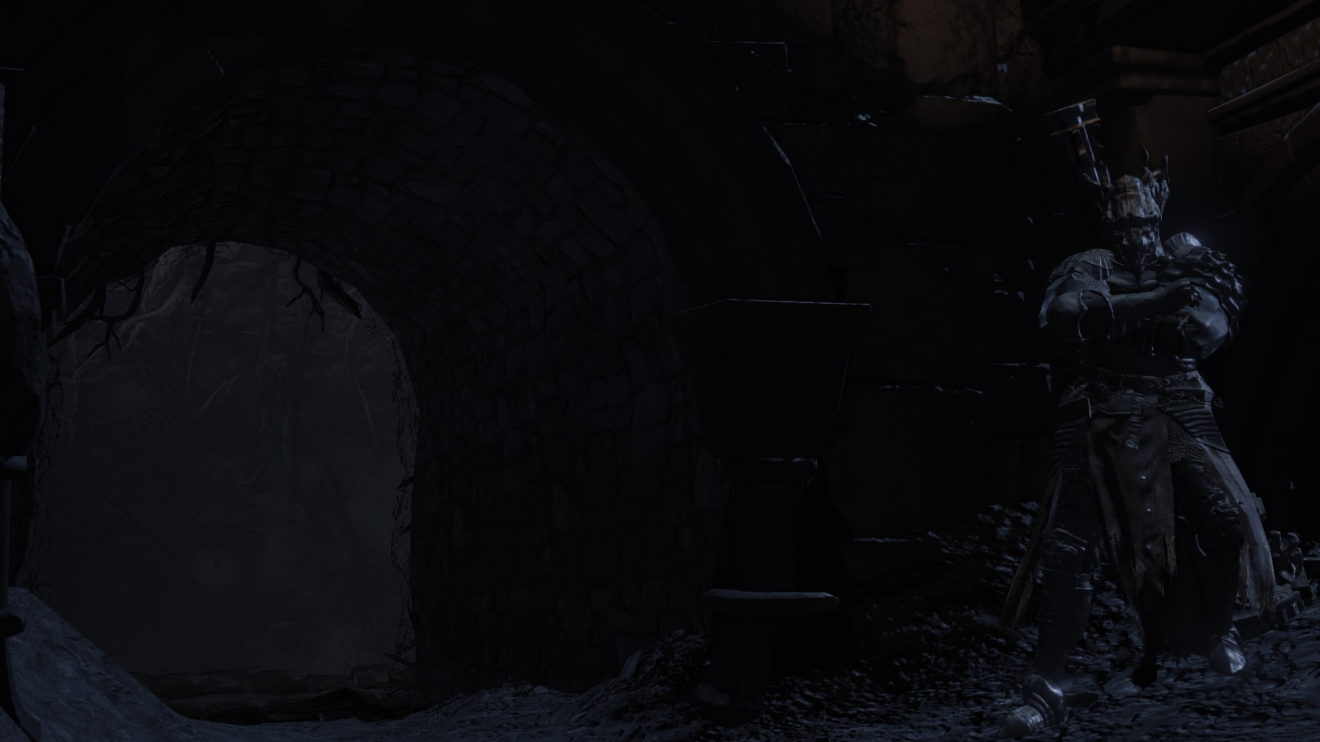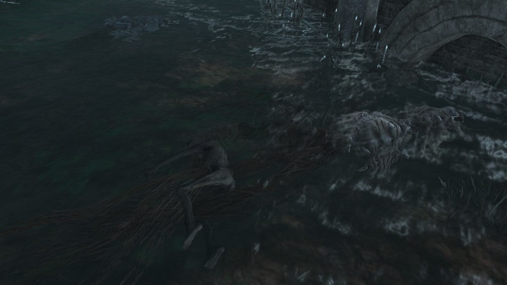 Lying dead in the stream just outside Irithyll is a body with a Ring of Sacrifice, suggesting that one of Velka’s followers recently attempted to infiltrate the city — the surrounding sewer centipedes show how that turned out. Another seems to have had more success. In the sewers of Irithyll Dungeon hides two chests. One contains the key to open the older prison cells; the other is a mimic carrying the Dark Clutch Ring. This location implies that the owner really didn’t want anyone in the dungeon to know about it. Why? The ring increases the power of Dark attacks at the expense of Dark defense, indicating the the owner employs such power. Moreover, the crow foot-shaped item was associated with Velka in DS2. Taken together, and the owner of these chests is likely another servant to the Goddess of Sin. Whatever his plans for nabbing the Old Cell Key, his hiding place was evidently never discovered. Still, the corpse lying face down in the nearby sewage with the Soul of a Weary Warrior suggest that he too might have met his end at the hands of the rats or basilisks infesting the area.