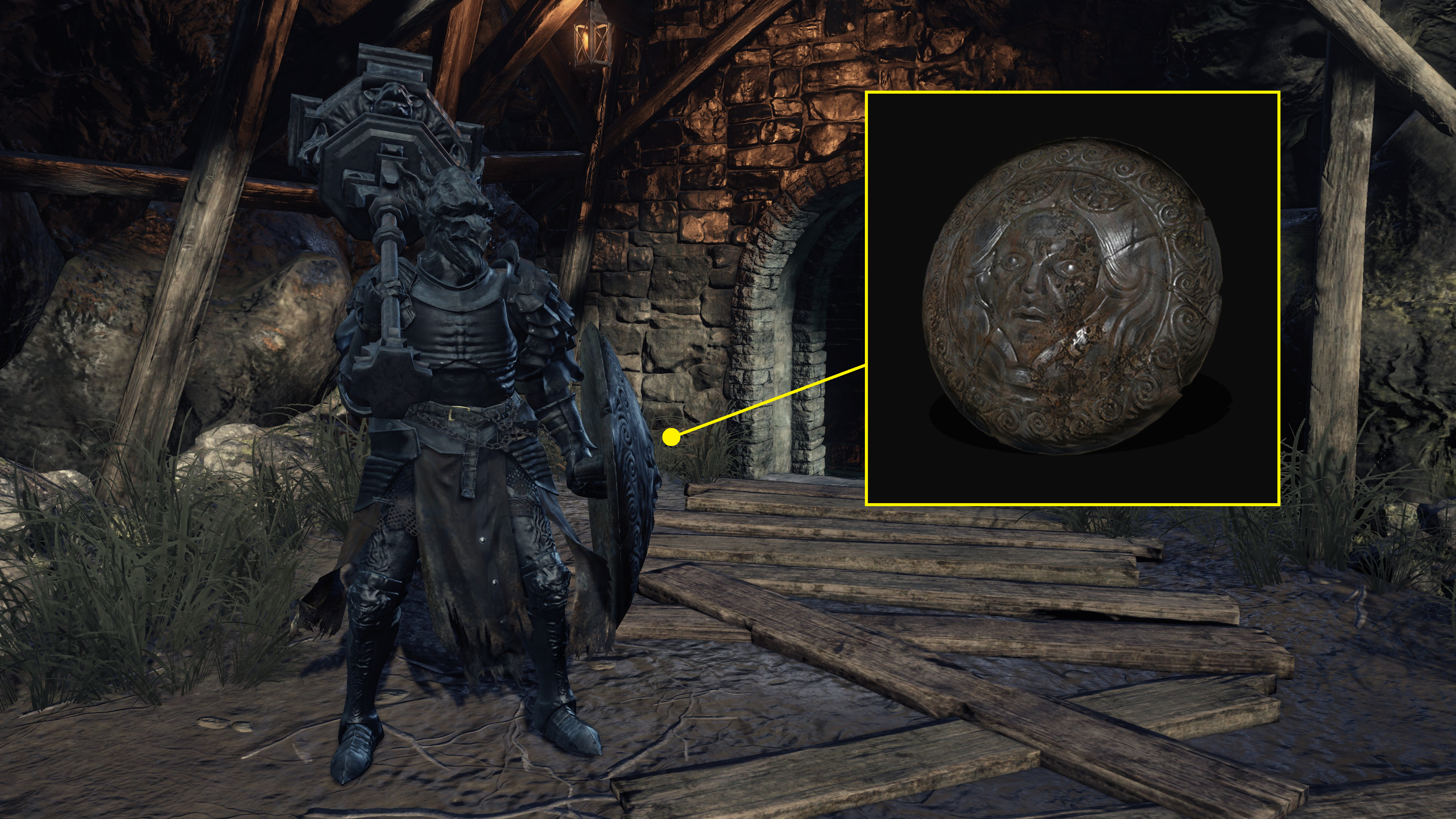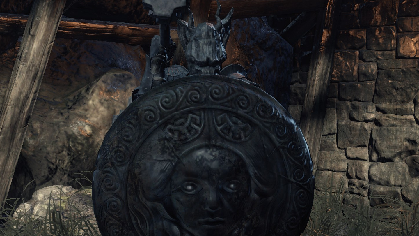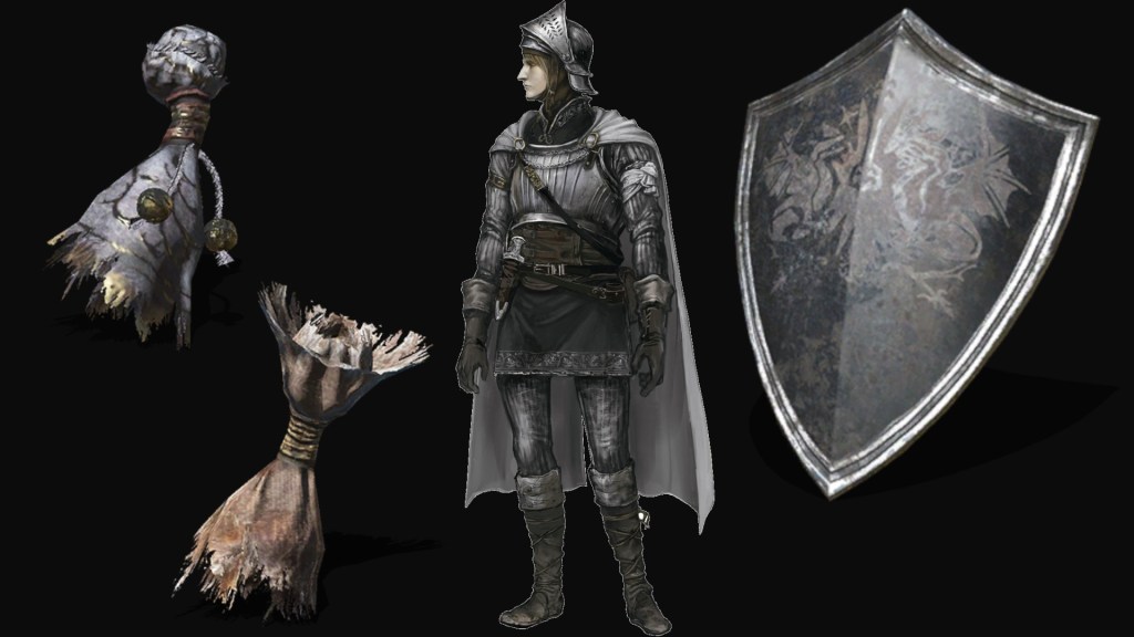 As a knight, Eygon was conferred an award of his choice along with his status, oddly requesting a greatshield bearing the face of his elder sister of some years. Stranger still, this knightly decoration was made to moan by offering it a quiet prayer, which attracts enemy attention. But while everything about this “Moaning Shield” seems as grotesque as Eygon’s armor, it likely came from a place of affection. The image of a giant woman shielding him plus their relative age suggests that Eygon’s sister protected him when he was very young and unable to protect himself — he could depend on her to take on every threat. If so, then it is odd for him to insinuate women on the battlefield are in as much danger as men in Undead land. Is he simply a hypocrite, or speaking from experience? The shield’s moan leaves ominous implications for his sister’s ultimate fate. Perhaps he wasn’t the first in his family to pursue knighthood, and lost the sibling he admired because of it. In that case, the shield serves as both a memento and memento mori for the newly-appointed knight. As always, she would be his source of strength going forward.