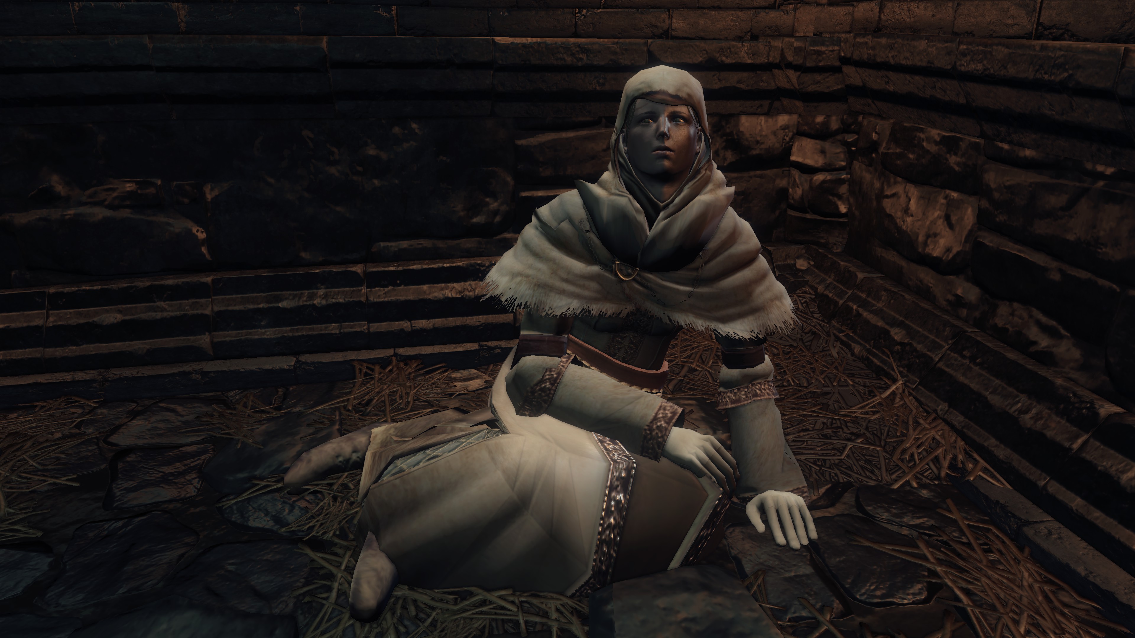 Of course, not every Undead was sent as a sacrifice to the First Flame. Irina headed to become a Fire Keeper, hence wearing the traditional white instead of blue. By all indications, the nun was previously just a dedicated storyteller, even learning how to read braille scripture while still able to see — certainly no fighter, befitting her Greek name meaning “peace”. In fact, the description for her ashes notes that such weakness suited her position in the church, thereby implying that fighting strength decides which clergywomen are made offerings versus guides. This explains why potential Fire Keepers are assigned an escort and unprotective uniform for their travels; they are incapable of protecting themselves anyway. Another benefit to providing a bodyguard is having someone ensure their health doesn’t deteriorate midway through.
