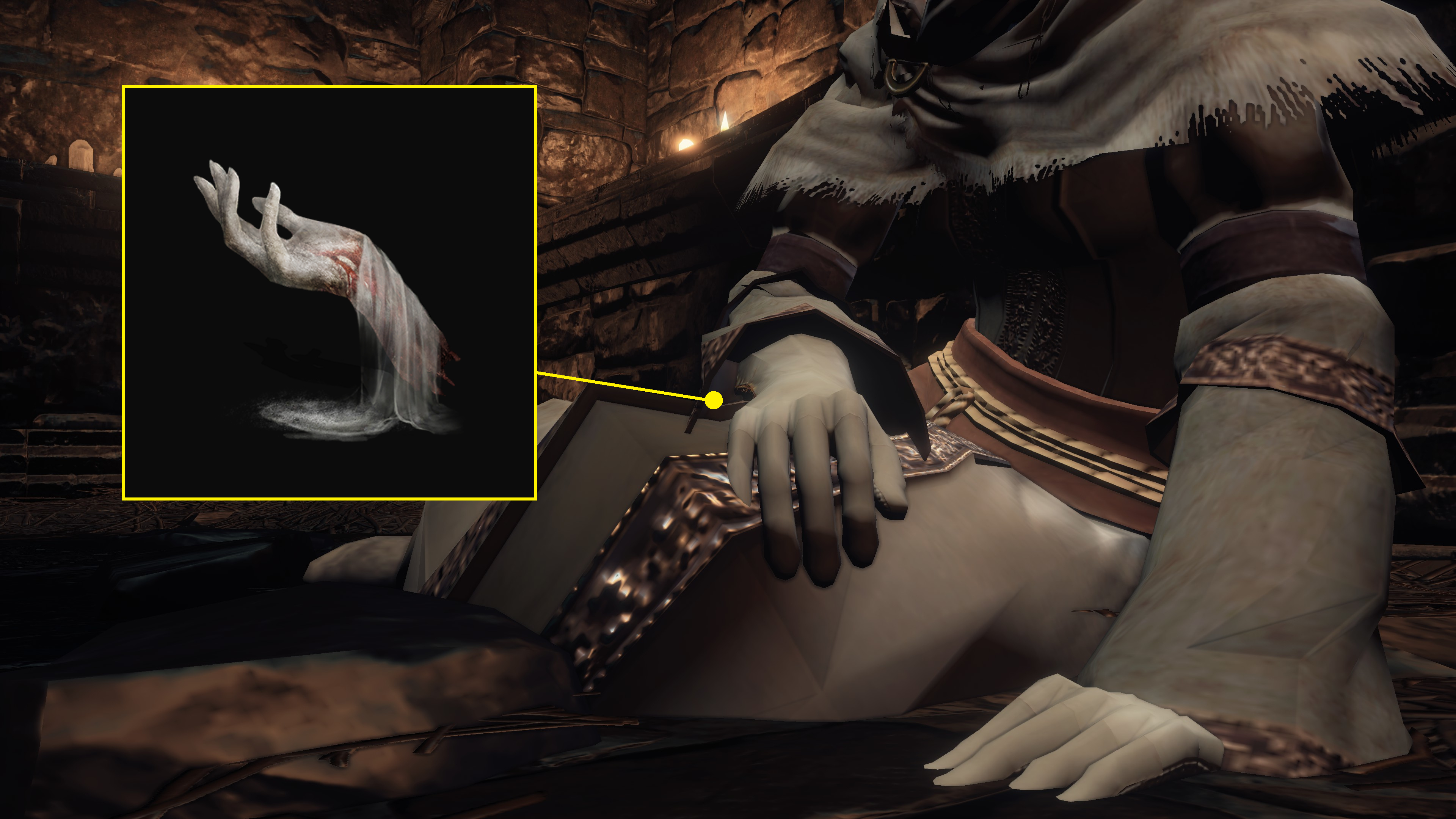 This scenario runs one of two ways. If we give Irina only holy books to teach, she gains enough resilience to the humanity inside her to complete her Fire Keeper training, moving to the shrine mausoleum. With his reason to help us gone, Eygon is next found dead in her old cell, presumably having committed suicide to atone for his dishonorable failure — he was the true wannabe hero. But if we have Irina teach heretical scriptures, it only agitates the humanity, the resulting pain breaking her completely. Eygon will then attempt to kill us for our betrayal, but not before trying his best to save her. The knight possesses an empty Estus Flask during this encounter, indicating that he used it up just before we arrived via the bonfire. But the knight differentiates himself from Undead, so why does he even possess one of their treasures? Because it wasn’t given to him, but his charge, whose pain he tried to alleviate by making her drink from it after dragging her outside; away from the bad influence. That affirms both her undeath as well as his desperation to keep her alive.