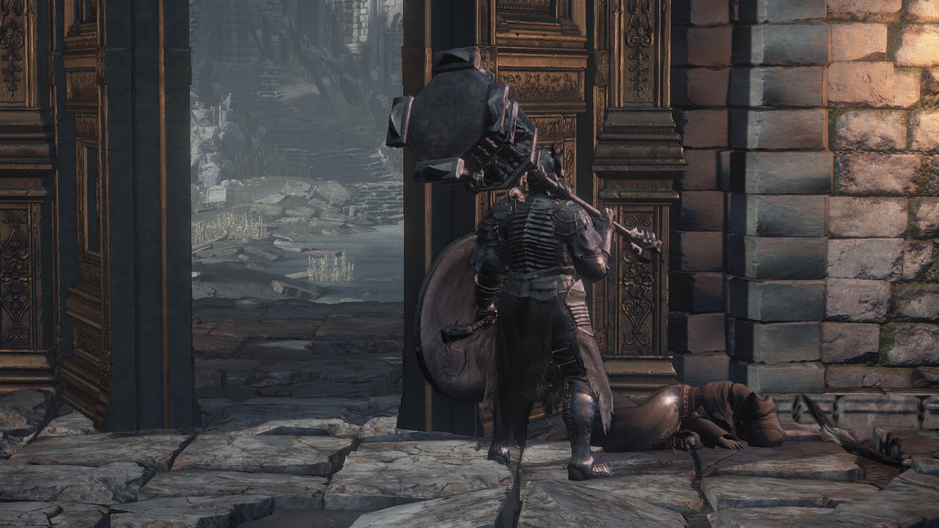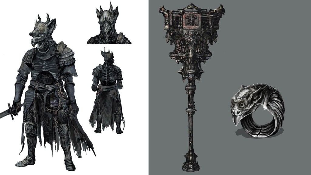 As seen with items derived from the Paladin’s Ashes, many weapons from Lloyd’s era have remained, including the church’s old crescent axe and gory morning star. But new ones from DS2 have also been added to its repertoire, such as the red-handled halberd. The Cleric’s Sacred Chime has similarly been adopted as a basic miracle catalyst for Undead clergy, probably to make the cursed easier to identify from normal clerics wielding cloth talismans. This cultural exchange also led to the Way of White embedding itself into Lothric religion. Greirat provides a Blue Tearstone Ring he presumably stole after infiltrating the city walls, and can later sell Carim’s sniper bolts pillaged from the neighboring Undead Settlement. Lothric Castle is home to a Red Tearstone Ring, Caitha’s Chime, Sniper Crossbow and bolts, and Sacred Bloom Shield. The Fleshbite Ring can likewise be found in its Grand Archives. Taken together, high-ranking clerics from Carim and their warrior entourage kept a presence as foreign ambassadors. Their role would be to help secure not just the link with the New World, but also the firelinking ritual.