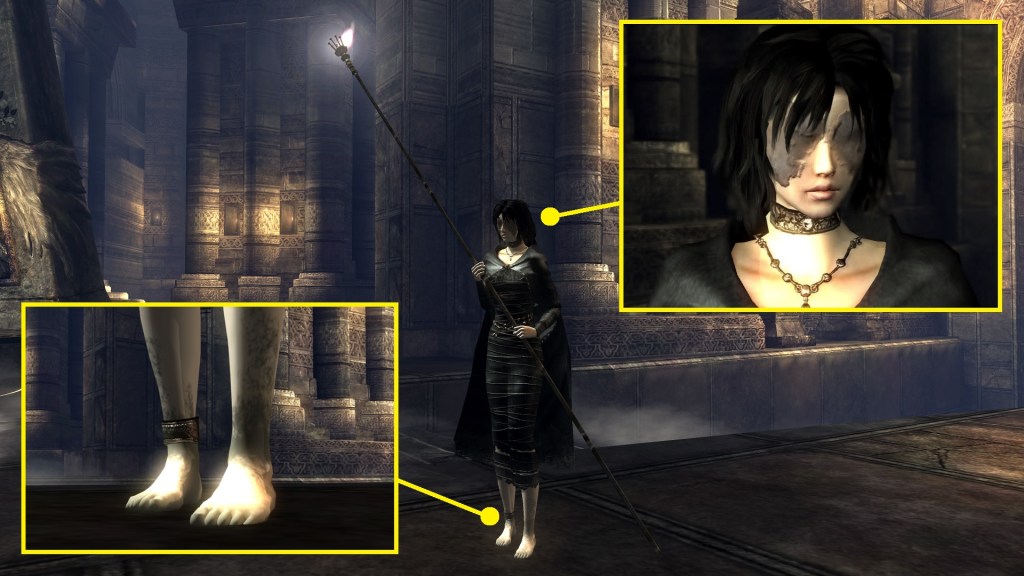 The Maiden in Black is a solemn female magic caster trapped in the Nexus like us, wielding a lamplit staff to help keep the temple operational and first summon us there. She is also a demon with all the powers therein, as evidenced by the Soulsucker spell derived from her soul. The spell’s description further reveals that she was previously one of the old demons, dating her lifetime to the First Scourge — that she was also the most dangerous implies her to have been an Archdemon in particular. And despite Freke’s insistence that she would welcome death for being “violated” by demons, the last Monumental indicates that she would be a demon by choice even if she wasn’t bound to immortality. Most humans turned demons we encounter desired the power of demon souls to achieve some end, but we are provided no indication of why this mysterious Fire Keeper sought the Old One’s strength. Instead, she demonstrates a loving nostalgia for the beast, treating it like a mother would a baby, and chooses to be with it in eternal slumber at the end. This zealous love for a harbinger of the apocalypse betrays her history.