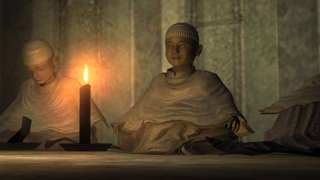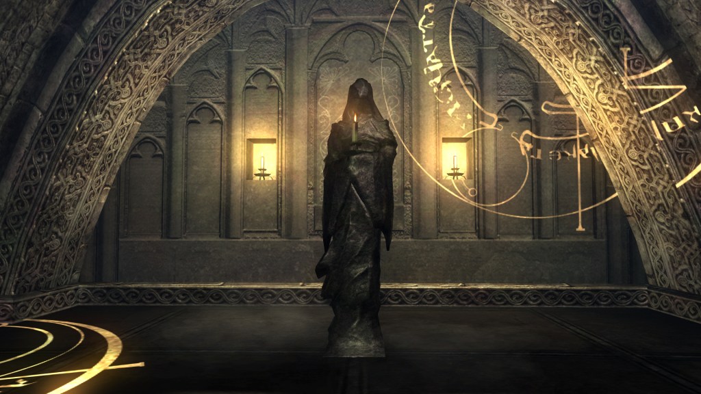 Naturally, this battery can reach its own limits. All but one of the many Monumentals have been “lost” and look no different from corpses, their candles extinguished. She blames this on the fact that “time is long” in Japanese dialogue. And since they cannot die by conventional means, their souls being completely drained is likely to blame. Indeed, they are no longer living beings, so what would be left to animate their nonhuman bodies? This role as a battery probably also makes them incapable of leaving the temple. This doesn’t stop them from interacting with the world, as the last demonstrates when helping us find the tear in the fog through some sort of magic, but it does make the Nexus more of a prison for them than for us. Perhaps they felt the need to atone for their culture’s transgression, or perhaps they simply believed themselves solely capable of performing this duty. Either way, they chose to become “Keyman”, (要人) entities just as “necessary” for holding the world together as the Archstones themselves.