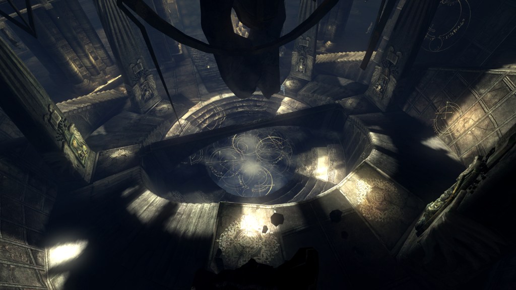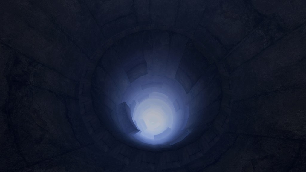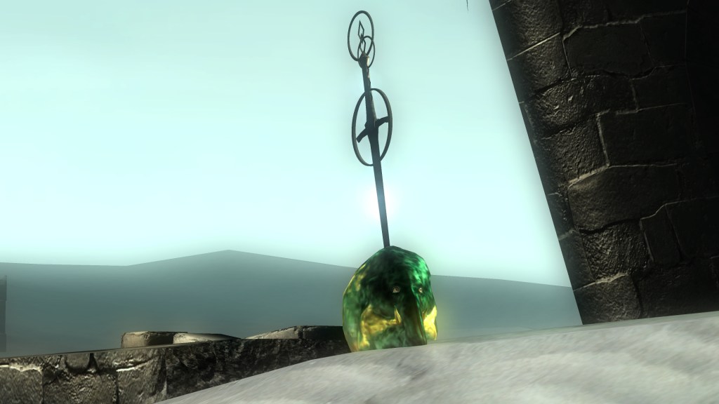 The same peculiar spears flank the temple’s largest statues of hooded figures, one hanging upside down beneath the other like a bizarre mirror as sunlight shines down upon them from a hole in the ceiling. The top statue holds a staff in one hand and a sword in the other, dropping the latter to shatter the magic barrier blocking the central pit below. This is our only exit, and it requires us to fall down the massive shaft until the light at the other end of the tunnel blinds us, at which point we regain consciousness face-down on a beach. And there with us is the statue sword, stuck in the sand just like the spears. By all indications, it is the Nexus which loads these spears into a statue to then drop upon targets below, which would imply that the actual temple is floating somewhere high in the sky.