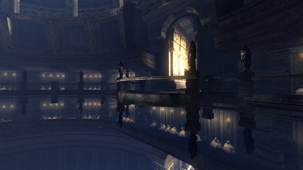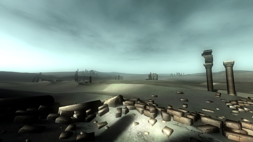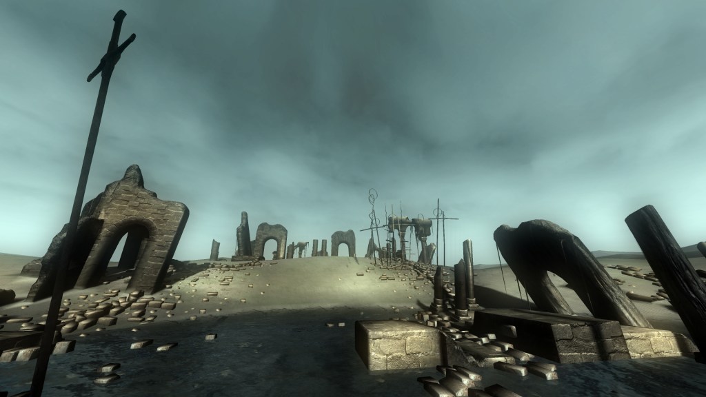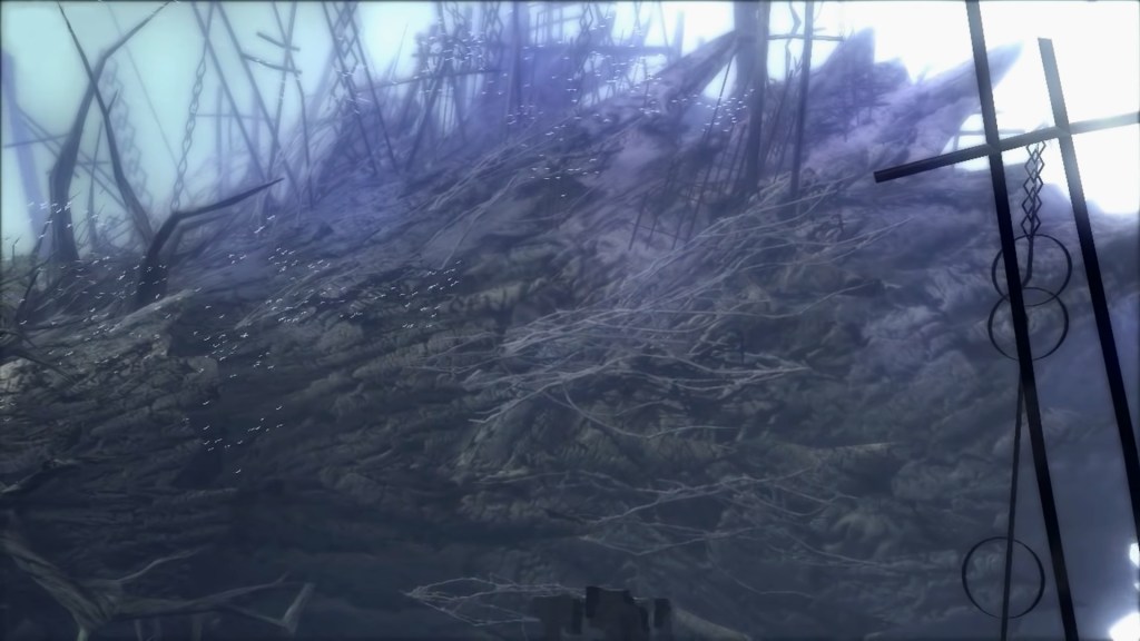 It is odd that we find ourselves on a temperate beach when the temple was discovered in a hinterland of icy mountains according to the official Japanese website’s prologue. With the Old One freely spreading the fog across the world, this beach cannot be some dimensional space within the Nexus where it was sealed. Taking the spears into consideration, and it is most likely the remains of a battlefield from the First Scourge — that would explain the broken columns and doorways half-buried in the sand there. Perhaps the ruins were once a Monumental city, but they nonetheless indicate that the Nexus is transporting us to a completely different location. In that case, the temple must be flying through the sky via magic, moving over this beach location during the final leg of our journey so that we can confront the Old One lurking in the fog there. Indeed, the form the Nexus takes requires that it be a flying temple.