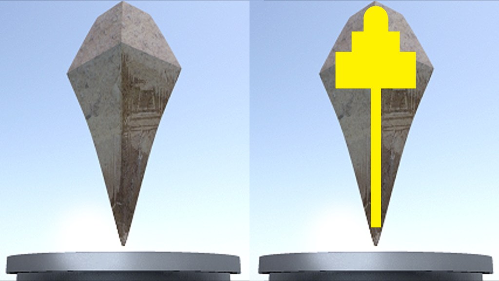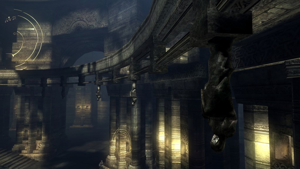 The game’s platinum trophy features an angular stone object resembling a nail. Every other trophy employs a recognizable character or item model, so why use something so abstract and nondescript for our ultimate achievement? Because it isn’t just a random shape, but the exterior for the hub area from which we access so much of the game. The dimensions of the “nail” mesh well with the Nexus’ layout, especially the long taper to the bottom where the exit shaft would be located. Moreover, a cut codex entry confirms that the temple is built from a mass of rock shaped like a lynchpin. And just as the Monumental describes the awakening, battle, and subsequent sealing of the Old One, the accompanying cutscene shows a floating rock resembling this “lynchpin” unleashing some sort of magic from its bottom tip against a mass of bramble resembling the beast; the surrounding sea of flames even lines up with the beach ruins, some of which have been seemingly melted by intense heat to varying degrees.