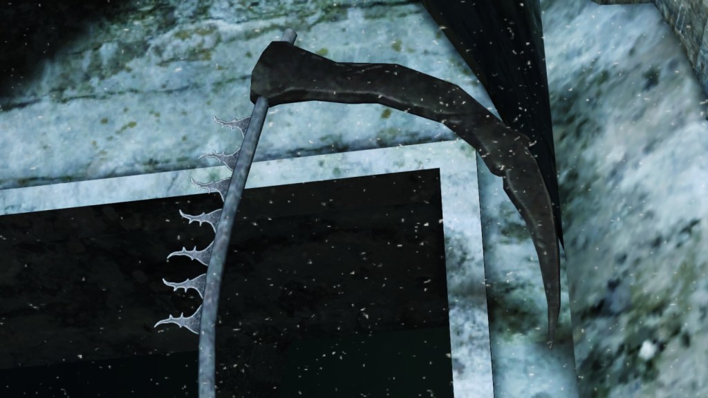 Perhaps the God of Blood only exists to justify his followers’ atrocities. By inventing a deity dedicated to bloodshed, entire countries could rationalize war as a divine mandate — the cut robe text even describes him as a war god instead of a blood god. If nothing else, Nahr Alma is a convenient figure for humans seeking unsavory ends. And if there is a god behind the idol, then more power to the legitimate adherents. Indeed, there is no denying that Nahr Alma’s disciples treat him as an actual deity, with the magic weapons provided by the Brotherhood of Blood being primarily used for secret ceremonies or religious festivals. The scythe bearing his name in particular even requires faith to wield. But whether that translates to an actual god, male or otherwise, is another story. The only devotee of Nahr Alma we meet is Gren, and this tiny man casts his unholy hexes with the chime of the God of Tears Caitha — or perhaps that is the answer.