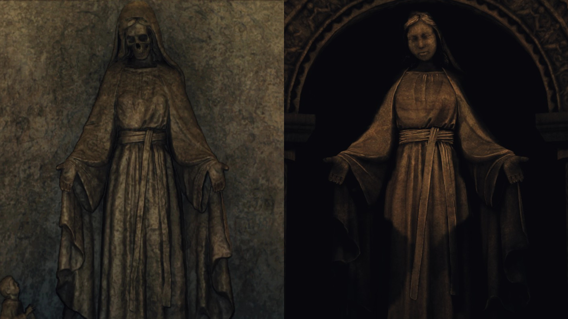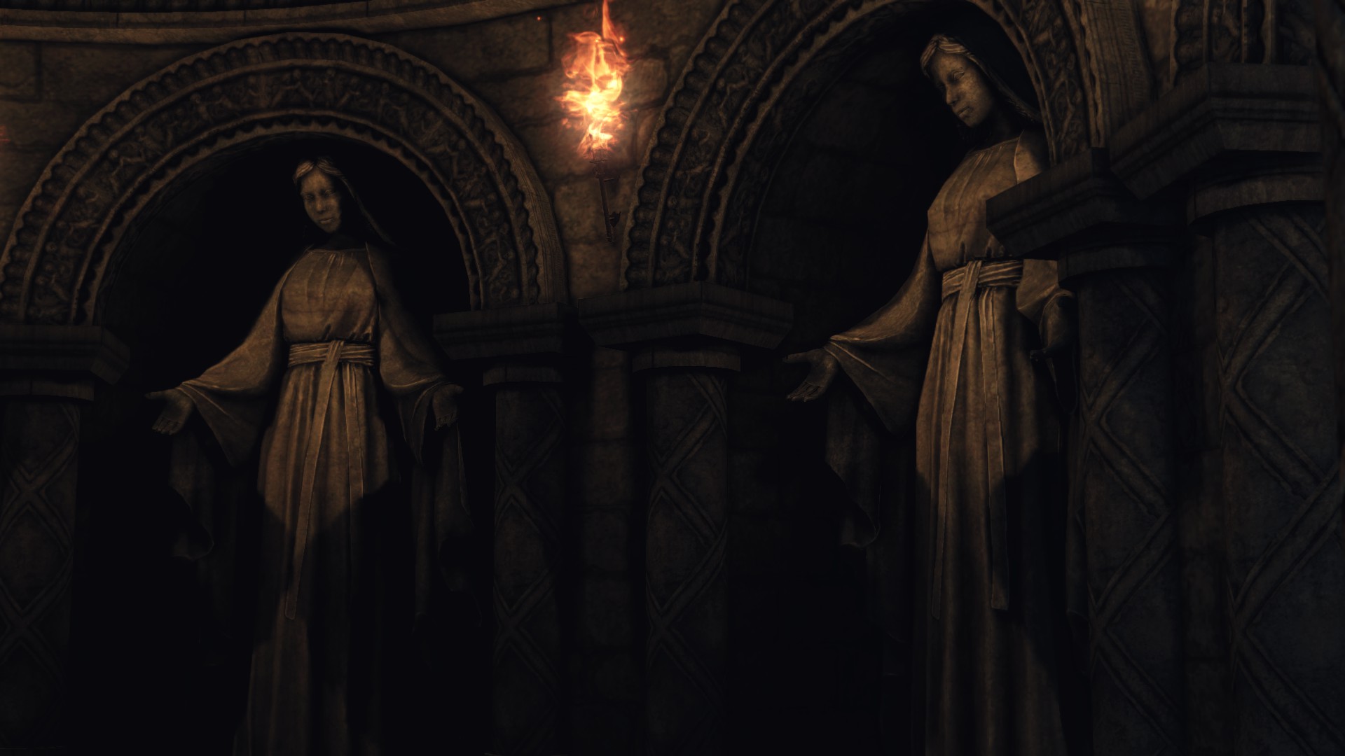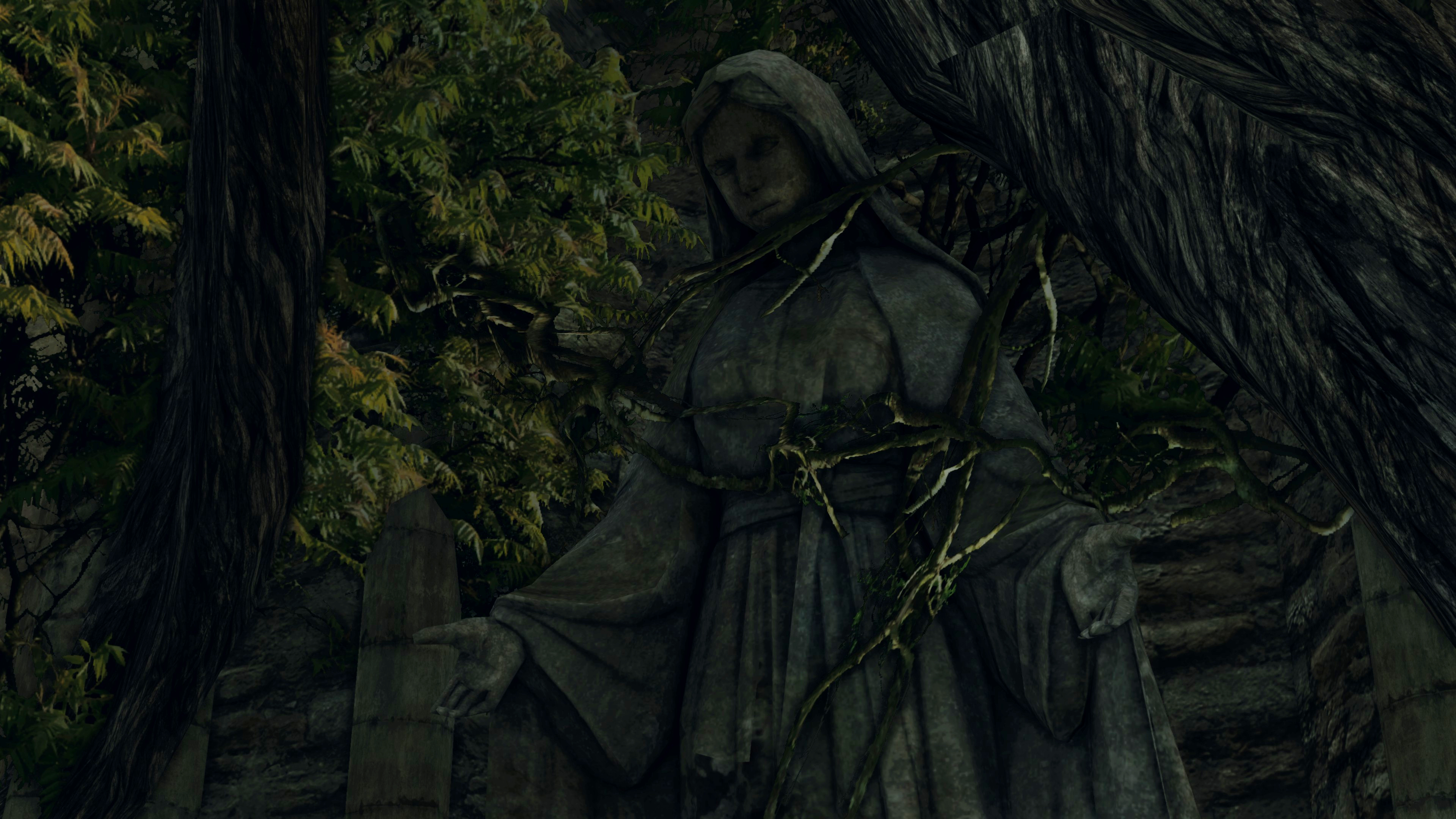 Trot up to Cardinal Tower at the heart of Drangleic’s fortress, and we come upon a striking statue enshrined within. Beneath the overgrowth and murder of crows, the figure appears to be a holy woman — her dress and pose resembling depictions of the Virgin Mary — and exudes warmth, seeming inviting and motherly. Who is she, and why enshrine her in a military installation? We can spot the same statue situated atop the bridge archway at the entrance to the Iron Keep. Unlike the previous effigy, this one sports angelic wings while her outstretched hands grasp the chains hoisting up the hanging cages, giving the impression that she is the one holding the “leash” on their prisoners. Combined with the additional chains wrapping around the figures embedded in the arch itself, and this hooded woman looks to hold sway over the fate of criminals and noncriminals alike.