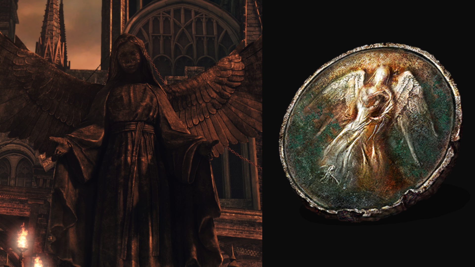 Taking the hooded robed into consideration, she must be the god depicted on rusted coins. These coins can be acquired from the puppets of Belfry Luna and Sol as well as in areas exclusive to Drangleic, meaning the kingdoms of Alken, Venn, and Drangleic all circulated this deity’s image in their currency. Most likely, Drangleic adopted the coinage from the Iron Keep like other elements of its culture, inheriting the icon along with it — and thereby the statue as well. If so, then this “angel” isn’t just a holy woman but some sort of god of justice or judgment. This is strange since the coins themselves provide some “good luck” when crushed, indicating the power inherent to her image somehow ties to fortune instead. They also have the angel clutching a book close to her chest, whether it be scripture or some other kind of knowledge. And while this goddess was “once” worshiped, the exact origins of her image and thus her very identity is no longer a known quantity. This therefore excludes any possibility of her being a still relevant deity like Quella.