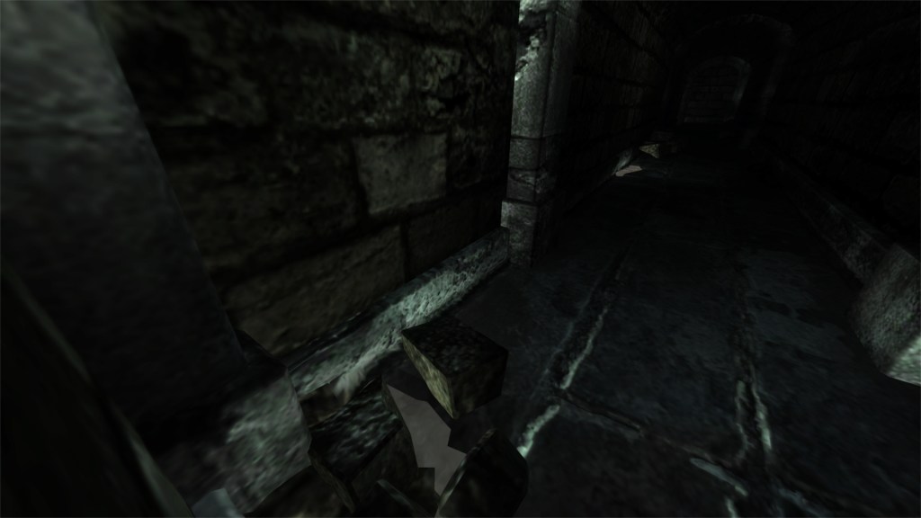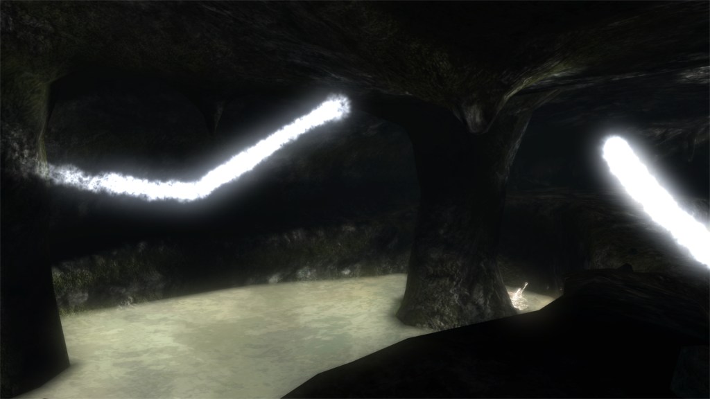 The purpose for cleansing the body with this particular water, again, probably relates to storm worship. Subterranean caves tend to accumulate what rainwater seeps through the rock, making it essentially a gift from the heavens in the Shadowmen’s religious framework. The lightwater’s faint yellow glow would certainly add to that impression, especially since we see shadows respawn from these water pools. As a matter of fact, we can spot thin canals carrying lightwater across the floor of every large chamber, and the broken flooring in practically every part of the shrine and fort complex exposes more underneath. Taken together, the priesthood clearly considered the cavern to have some kind of blessed water tied to the afterlife and maintained a system for distributing it through the rest of the facility — there is even a well in the fort on the highest stratum. In that case, purifying the body might have served to prepare the Storm Hero for being immersed in those divine skies.