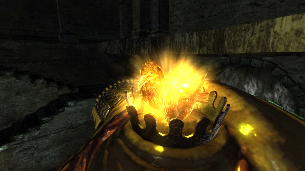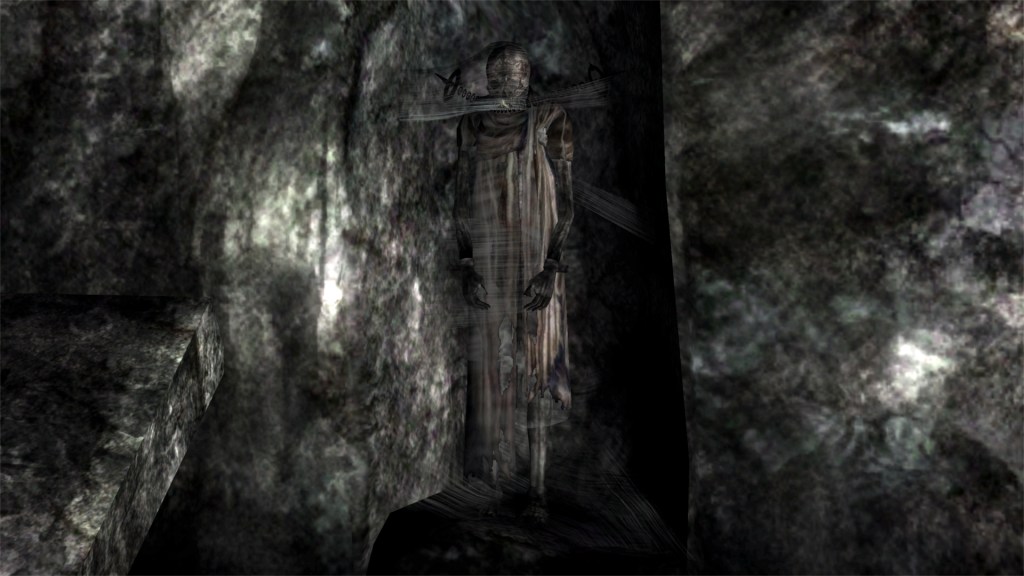 This unique combination of geology and meteorology may have been what persuaded the tribe’s ancestors to settle that remote island in the first place, using its magic resources to create their weapons. Absent that knowledge, their descendants would only see its empowerment of souls. When we encounter the Old Hero as a demon, it isn’t in the flesh — his body never moves from the wall where it has been interred. Rather, it is a glowing yellow, ethereal facsimile we see overlapping with the body, phasing in and out with the sound of a heartbeat, until it finally comes to life and leaps down to block our way. This brings phantoms to mind, especially since the sword the demon grabs from the wall beside him doesn’t even have a corresponding physical counterpart. Instead of a reanimated corpse like other enemies there, the demon manifested from the hero’s raw soul. But rather than the standard blue phantom, this spirit matches the color of the magic water the body was lathered in. And if the ritual bathing had this sort of effect on the soul, then the priests would be able to observe it with their shadow summoning.