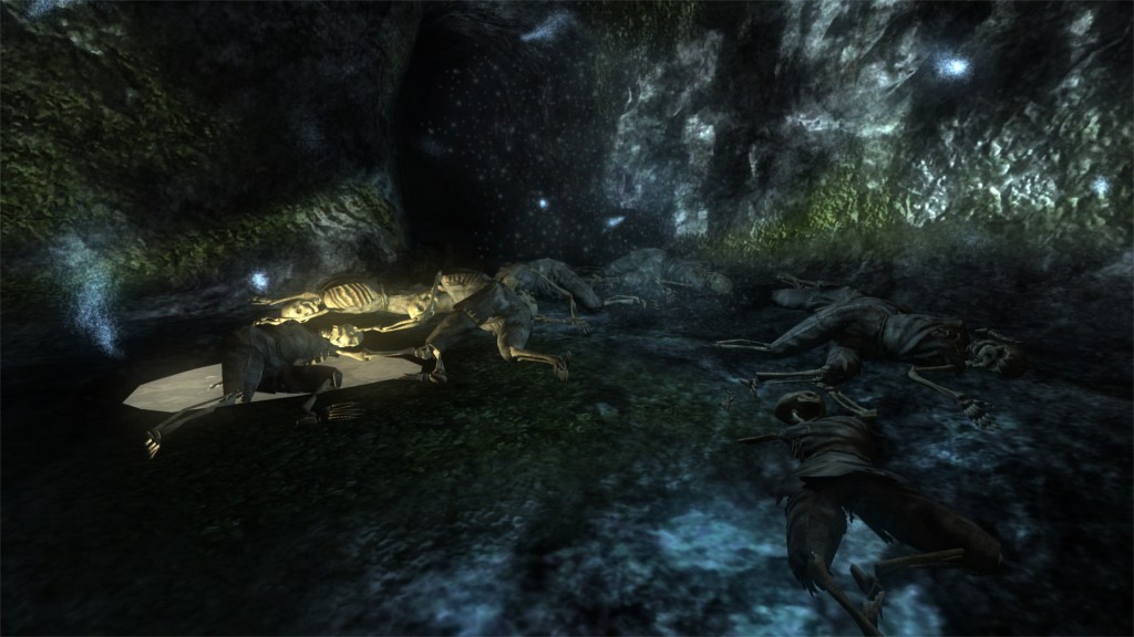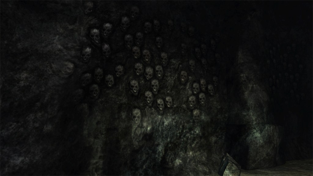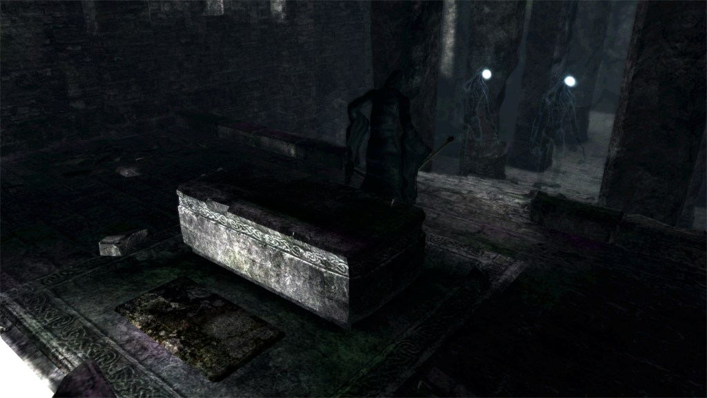 Finally, the body was brought out to the forest of monoliths behind the shrine and offered up to the storms. This implies that this ritual, and perhaps the others as well, were only performed during a storm — the one sign that their god was present. It also indicates that storms are fairly regular in this ocean, or else they leave the corpses to decay for long intervals at a time. The prevalence of darkmoonstone on this island may also support this notion. If the ore is formed from sunlight reflecting off of a mostly shadowed moon, then it may also form from what little sunlight filters through overcast skies. Regardless, the deceased presumably left for the next world while mourners provided their sendoff to the ascended hero. And once the funeral was complete, the body seems to have been brought back inside and enshrined within the walls, some now mere skulls or skeletal carcasses while others remain largely preserved. But already this begins to show the cracks in the pagan narrative.
