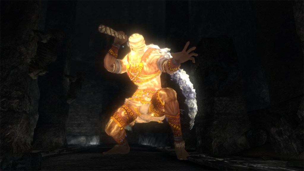 Once the judgement is determined, then comes the sorting. Despite souls and phantoms typically being considered a person’s essence, Shadowman religion seems to consider the “shadow” separate, as these occult summonings evidently don’t interfere with the dead’s judgement in the tribe’s eyes. Because of this, there was no issue with the priests keeping the “shadows” to defend the shrine while discarding the bodies to be devoured — arguably giving the damned some consolation. Conversely, virtuous heroes would have their everything brought with them to the next world, so we never see the reapers employ a “white shadow” or some such. That soul would be carried along with the body, onward and downward, deeper into the shrine, until it reached a large cavern underground. There they performed the next ceremony, a purification ritual where the lightwater pooling at the cave’s depressions would be poured all over the body laid upon another altar.