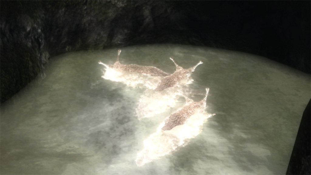This magical energy is what attracts the giant slugs to bathe in and absorb the liquid, causing them to likewise glow — unlike the same slugs seen clamoring for the magic power of the Moonlight Greatsword in the Valley of Defilement. For that same reason, these glowing slugs alone produce the sticky white slime we can use to enhance our weapons with magic. The souls in this slime are then recycled back into the water, as the white sticky stuff we can loot from a corpse mid-purification best demonstrates. But then what kickstarted this magic cycle? Perhaps this subterranean cavern is unique, gradually accumulating rainwater along with whatever souls the frequent storm clouds soaked up from the sun while never letting it evaporate back into the atmosphere. We do see lightwater, albeit faint, even in the fort, with its glow only intensifying as we descend deeper into the island. The result? Water with a particularly high concentration of souls pooling at the bottom. Indeed, the Valley of Defilement sees a similar accumulation of water in a lowlight depression and hosts the same slugs; it is only more recent human waste which has potentially interfered with nature’s course and starved the valley mollusks of their luminescent baths.