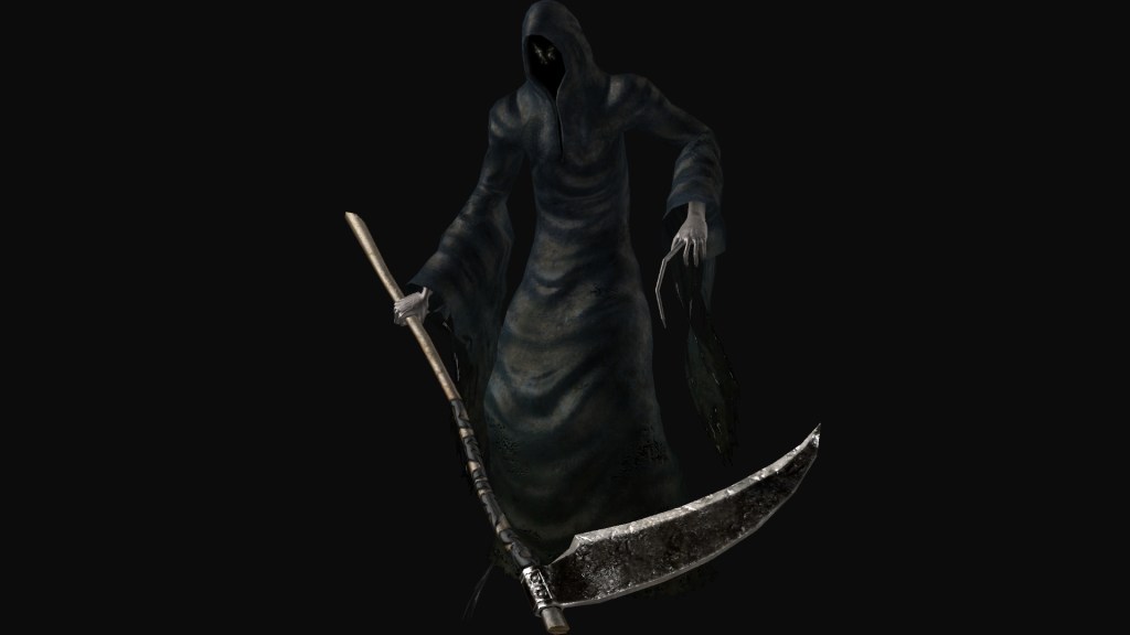 The reapers specifically summon shadowy figures with exaggerated humanoid form, mostly shadow men but also a fair number of shadow women. In fact, Blige’s Japanese dialogue indicates that the shadows were originally human. Most likely, they are some offshoot of black phantom. The Graverobber’s Ring is an old topaz band we can, fittingly, loot from the shrine; its effect? Making our soul less detectable to black phantoms. The source of the mind manifesting phantoms would explain why the shadows have white glowing energy largely concentrated around the head — which they can shoot as a magic beam — before flowing like veins throughout the rest of the body. Indeed, shadow women alone fail to vanish once the summoner is killed, bringing the added potential power of female souls to mind. Even summoning and enslaving black phantoms isn’t unprecedented, as Latria’s elder in yellow well demonstrates. All in all, it appears that these black-clad priests in hoods are reviving corrupted spirits of the dead for their own purposes. As to where the souls come from and why they are summoned, we need only examine the broader religion.