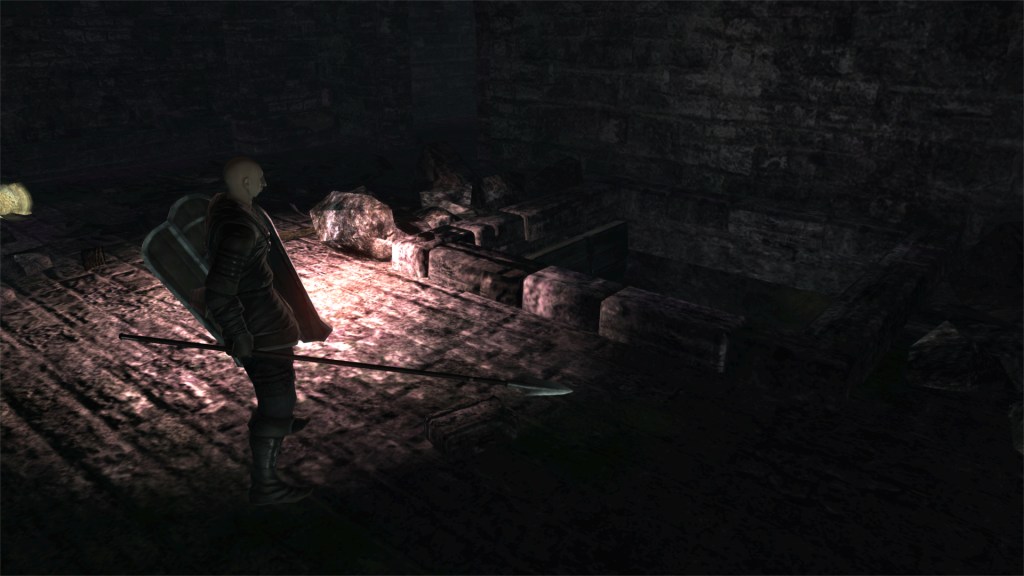 Not all men of dubious vocation on the island are so dangerous, of course. While Blige styles himself an “excavator”, (発掘者) the ring he own shows he is little more than a graverobber. How this differs from him being any other thief is that Blige dislikes killing, at least when it comes to his fellow man. It is because he didn’t want to deal with soul-starved humans that he came to the island, where it would only be the demons, the dead, and their treasures to loot. Despite what the localization might impress, the man doesn’t want to kill even the local skeletons or shadows since they were once living people, hence why he sticks to areas devoid of them and wears the ring for hiding from black phantoms. Ironically, this doesn’t stop him from recommending that we kill Patches, calling the “genuine trash” not worth keeping alive. The two clearly have a history, the fortress dungeon we first find him in being one of the thief’s snares that the graverobber fell into.