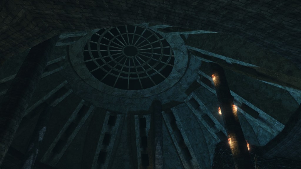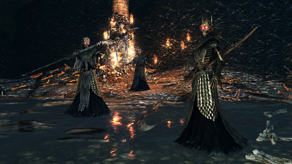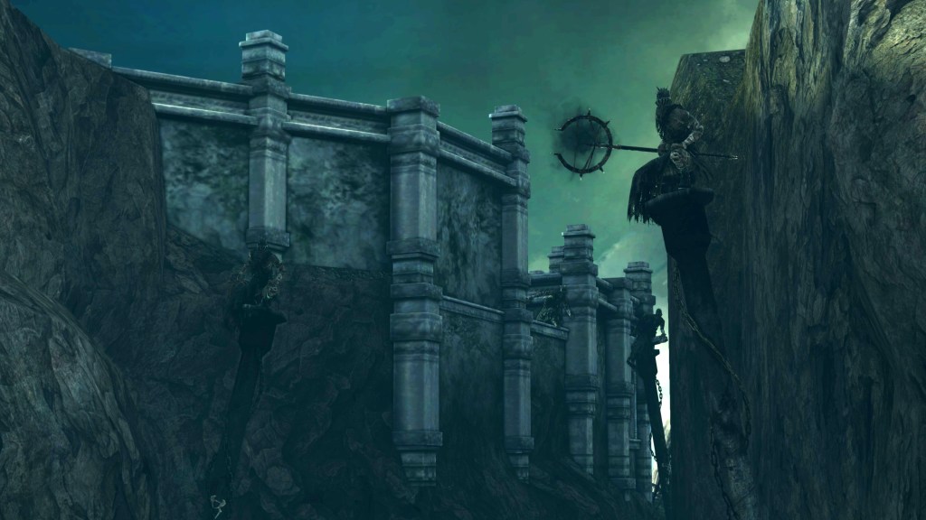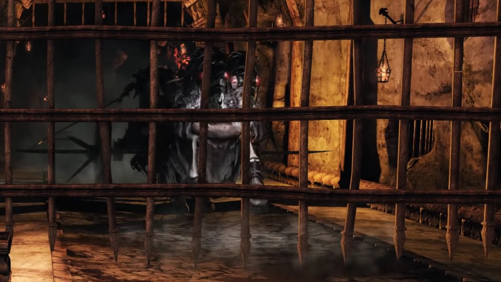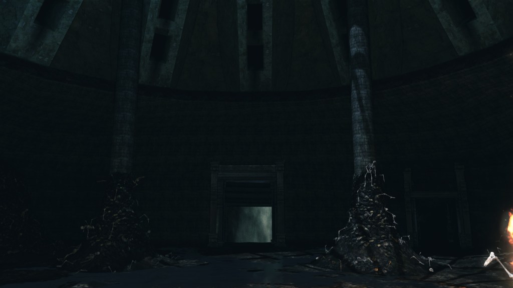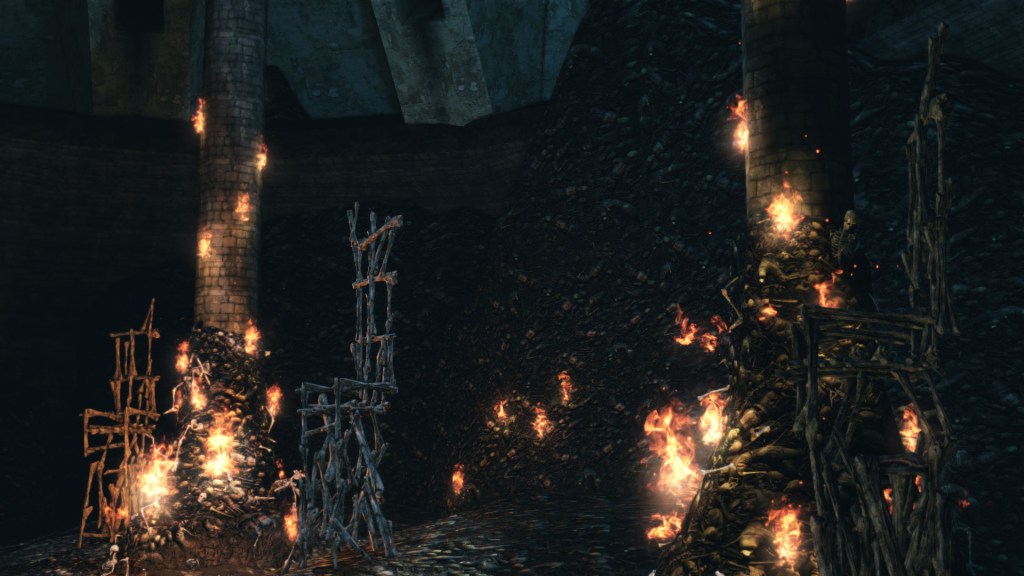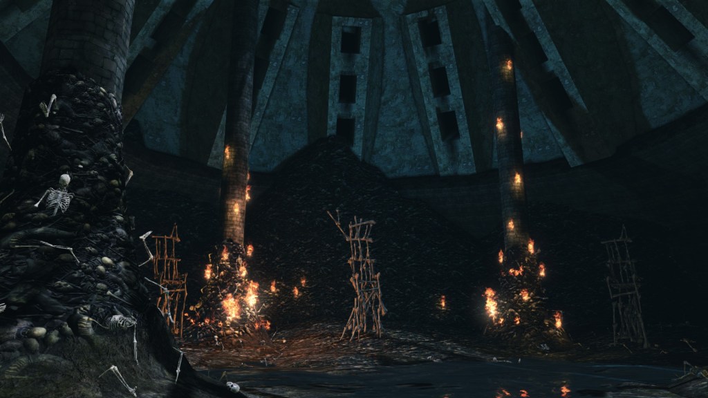 The Skeleton Lords were originally subordinates of the Iron King tasked with leading these Undead hunts. Two of three bosses are pyromancers, and Drangleic sorcerers in black lurk around the rest of the region, so spellcasters made up a significant portion of the hunting party’s commanders. And taking into account sorcerers’ penchant to investigate and experiment, their king should have kept his underlings on a tighter leash. Certainly, he supplied iron mechanisms for dropping grate gates or lowering stone bridges, safeguards to cut off the horde’s passage in the event of failure. But he never personally led them like the English text of the Bone Crown erroneously claims. Instead, he left them to their own devices, where they more than happily protracted their mission for personal interests. Undead were rounded up in newly constructed dome jailhouses before eventually transferred to a larger facility. This Undead Purgatory, or “Undead Execution Ground” (不死刑場) to put less poetically, seems like an efficient means to safely dispose of the kingdom’s dregs — until you see its agents.