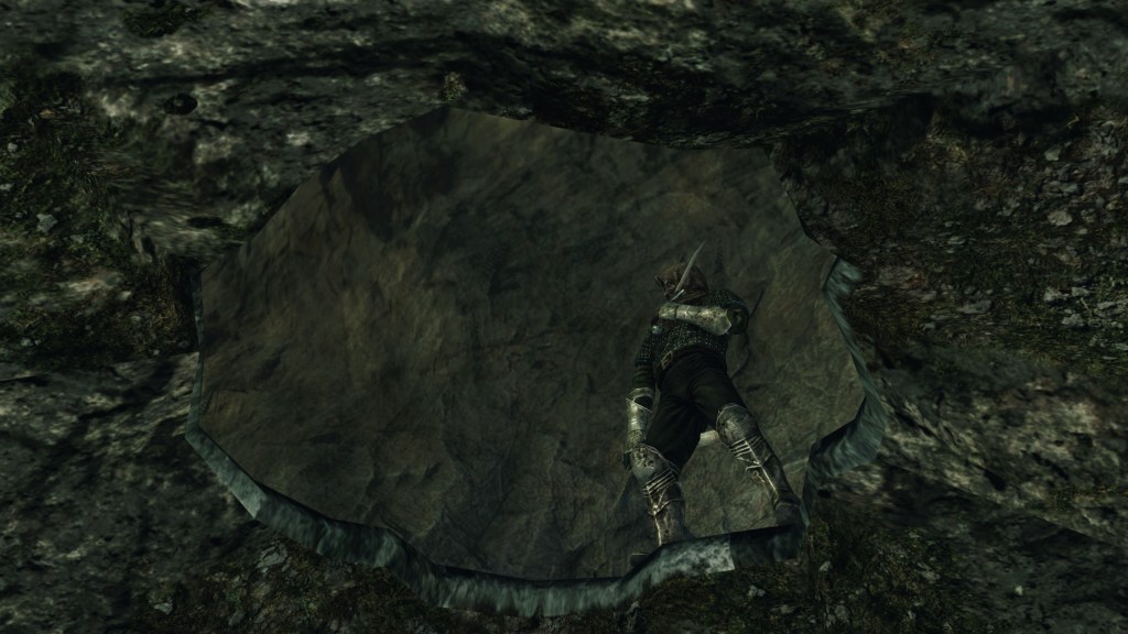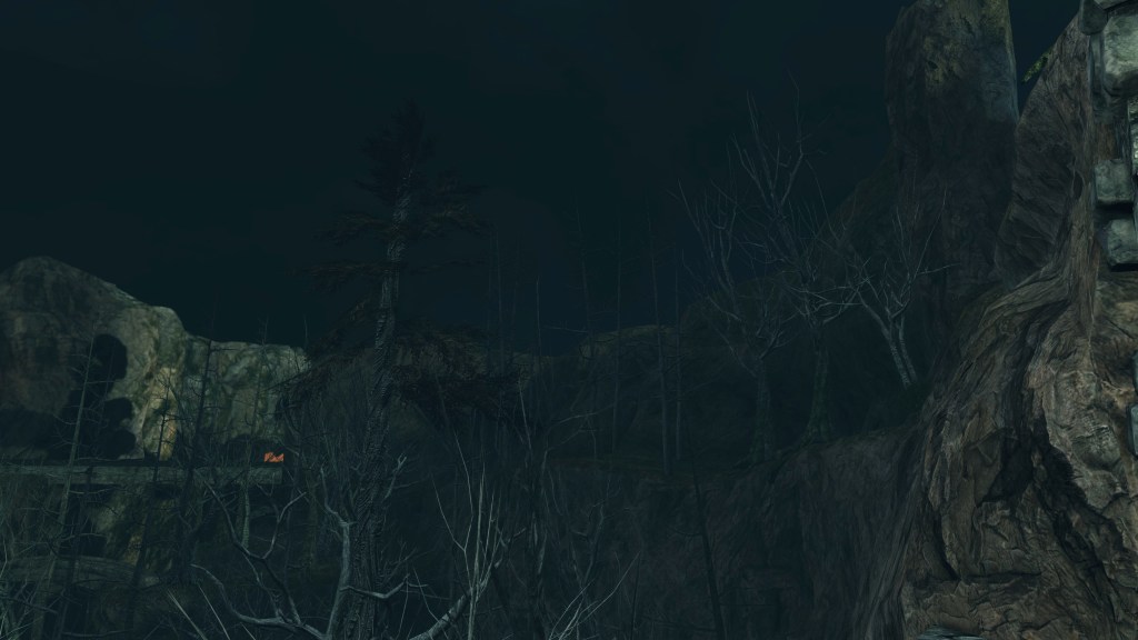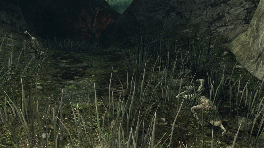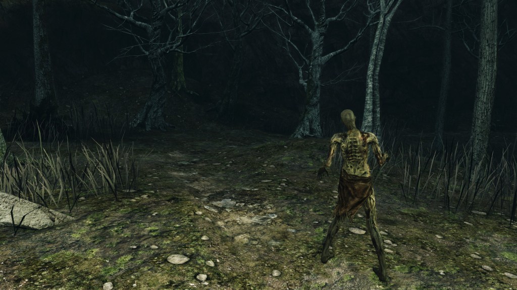 Some prey had the good sense, or fortune, to escape the hunters. After unlocking entrance to the copse at Heide’s loop temple, we exit a cave and come upon a meager camp with a bonfire. The localization names this an Undead Refuge, but it is more accurate to call it a “Hideaway”, (隠れ処) hence the camp’s placement behind the rocks, out of sight of the Undead Purgatory. Hollow prisoners nearby absently stare in the direction of the place they escaped from, fearing pursuit even now. Though they couldn’t escape the forest, these few have at least found a corner free from the unending torment. Others were not so lucky, a skeleton rising deep in the trees with naught but a torturer patrolling around it; the poor sap wasn’t brought back with necromancy, but the resentment of unjustly being hunted down to receive a most agonizing end. In fact, this game of cat and mouse might well have been part of the thrill for the hunters — nothing like building anticipation before the exhilarating climax. Letting a few get away was acceptable if it meant that they could play with their prey, especially with so many to spare.