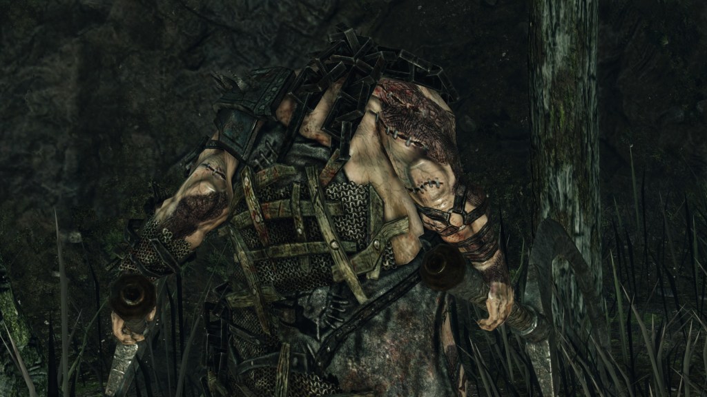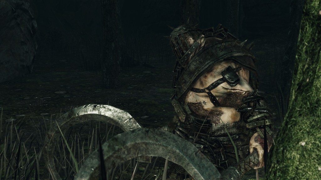 As to their killers, we find many Hollow thieves armed with daggers or short bows with poison arrows and armored in metal and leather throughout the area. The sheer number of criminals executed in medieval societies would lead to a disproportionate amount of bandits and highwaymen turning Undead and getting exiled. That they are the Hollows who have survived this long lurking in the forest, including one of the hunters’ facilities, implicates them as chiefly responsible for overwhelming the tourists; the nimble and wily robbers also look to have claimed their dogs. But more importantly, they prove that the hunters weren’t just slaughtering a horde of half-naked Hollows — indeed, some of their Frankenstein creations drop the bandit set. There were always risks to residing in a remote forest surrounded by countless violent madmen wandering around, so them being eventually overrun might have been inevitable. And whether slowly losing ground piece by piece or suddenly come down upon all at once, the hunters became the hunted.