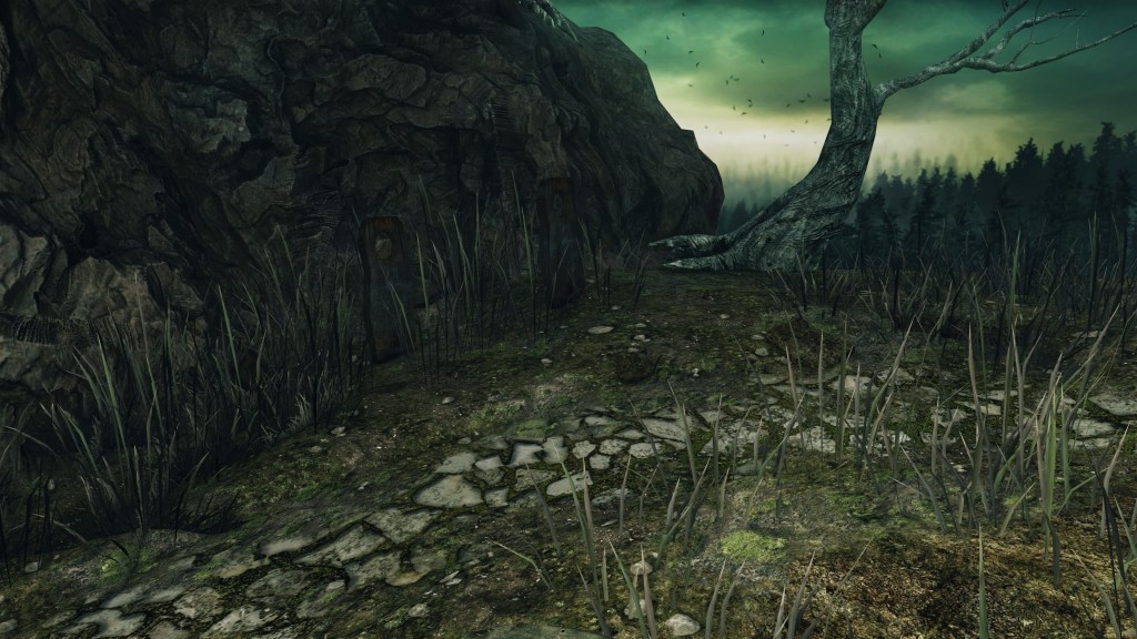 Put simply, the First Flame landed parts of the Black Forest on both sides of the mountain range. This awkward translocation allowed both to share many of the same elements. But because of the divide, each forest evolved in a different direction more conducive to its specific environment. This isn’t even accounting for different degrees of those shared elements — one has a single white tree, the other is a pale pond in an otherwise ocean of green. Neither does that account for elements exclusive to one or the other, like the grey forest of fog or mushroom colony. Only the butterflies, free to fly wherever, have remained constant. Even then, they have adapted to the changing environment, growing smaller and feeding on poison moss; the poison filtered out and released in dust clouds with a flap of their wings to ward off approaching threats. After that, this dense woodland wasn’t subject to human urbanization beyond Heide’s loop temple and short cobble roads. More than likely, it just served as a path to the Old One in the mountains past it. That might have remained the case had the copse not come to sit between kingdoms.