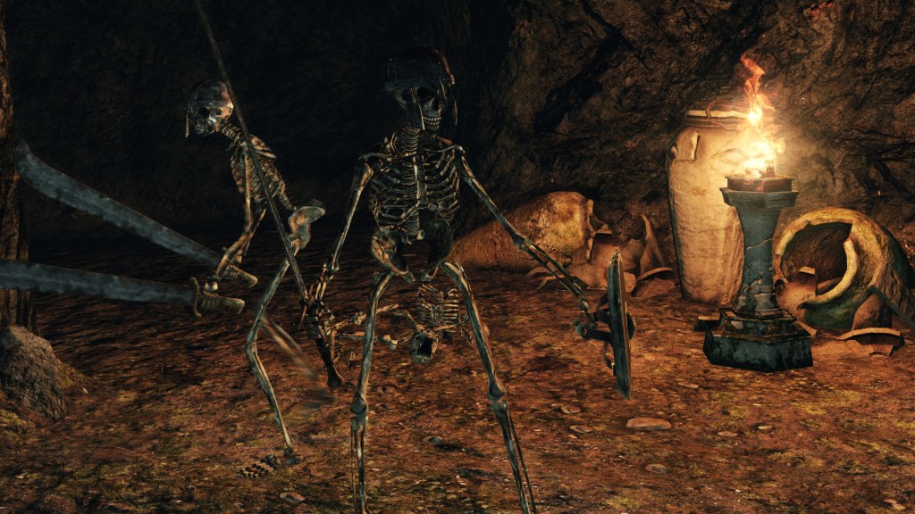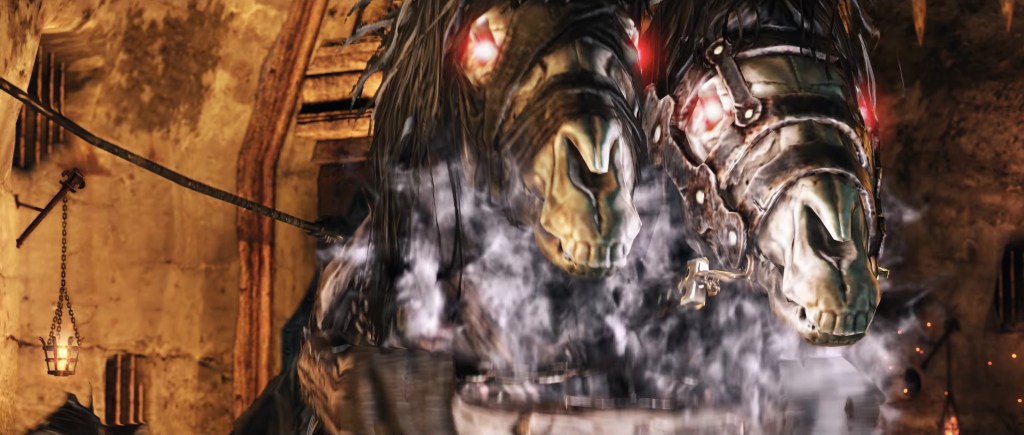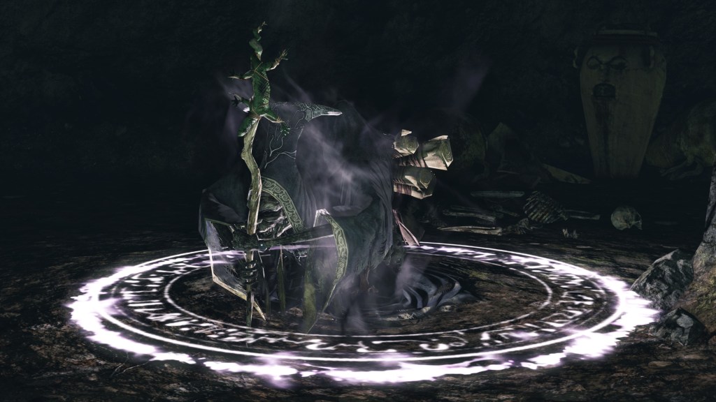 The executioner riding the chariot wears spiky armor to intimidate his victims and has apparently slaughtered countless Undead with glee swinging his sickle, but he is ultimately just a figurehead along for the ride. The one truly deciding the chariot’s path is the two-headed horse — a “life” created solely for tormenting Undead in the form of a hideous pair of horse skeletons. And while there may be nothing peculiar about the actual soul, the fact that this skeletal steed is frothing at the mouths with Dark power indicates that the necromancers dabbled with their own humanity to create it. It might be more accurate to say their victims’ humanity, for we see curse pots fill a cave where sorcerers perform their necromancy. As part of preparing a skeleton to reanimate, dark souls are apparently extracted from the bodies they did kill for later use or study. In short, they were more than happy to utilize taboo powers, especially if it involved their darker impulses.