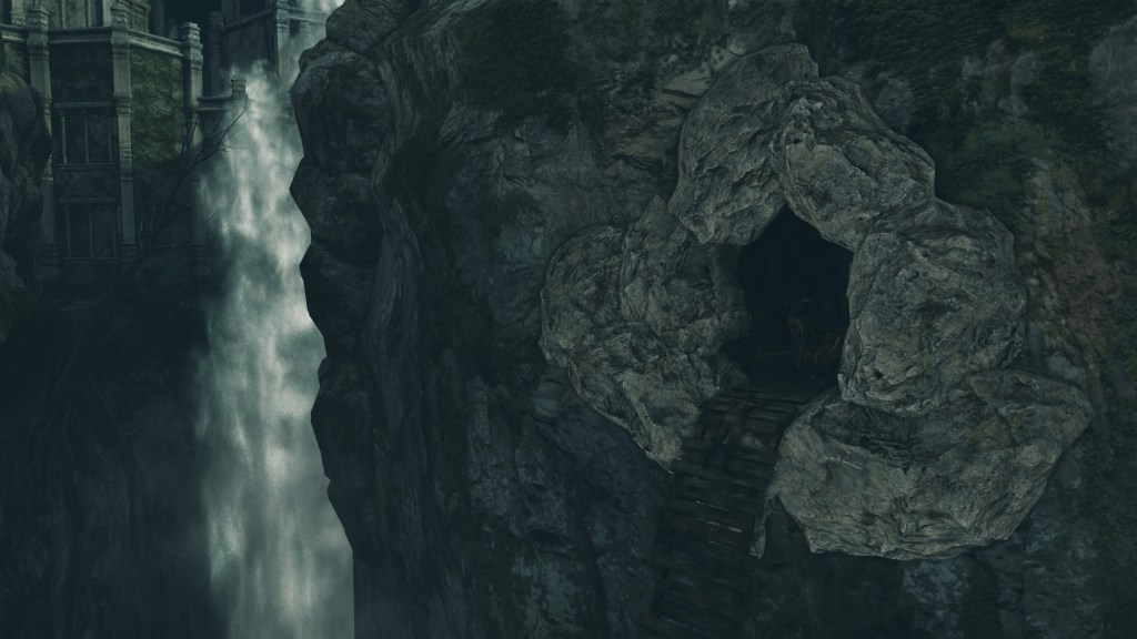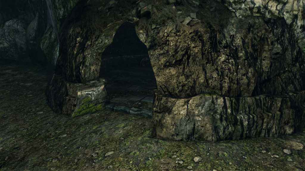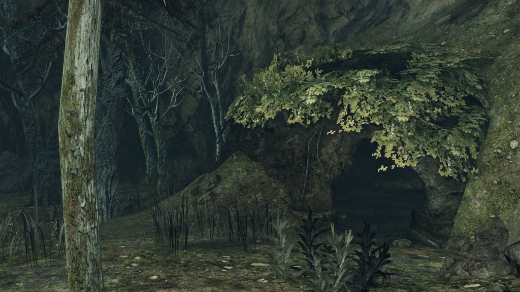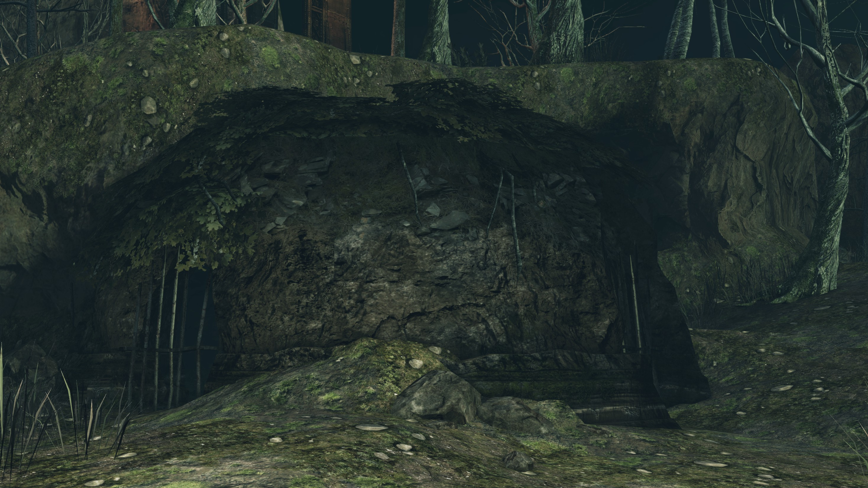 Before it became known as the “Forest of Hunting”, (狩猟の森) the copse south of Majula saw its start amidst the Great Shift. Looking at the official map, the area lies adjacent to Shaded Woods, separated by the western mountains. This begs the question: did parts of Darkroot Garden from the original Dark Souls (DS1) land on that side of the mountain range as well? While trees in the distance make it look like a conventional pine forest, the part we explore is filled with a variety of mostly leafless white trees covered in moss, bringing Oolacile to mind. There are also large red mushrooms caps growing on the walls within one huge cavern, the same seen in the Oolacilian mushroom-men’s territory; cut content confirms plans for the caps to be just the mushroom-men. Then there is Chameleon — an Oolacilian sorcery — found in neighboring Harvest Valley. Like the spell in Shaded Woods, the art has been recreated with common magic. Nonetheless, it implies that vestiges of Oolacile exist nearby. And with the valley also home to enemies from this Huntsman’s Copse, it is easy to imagine where specifically.