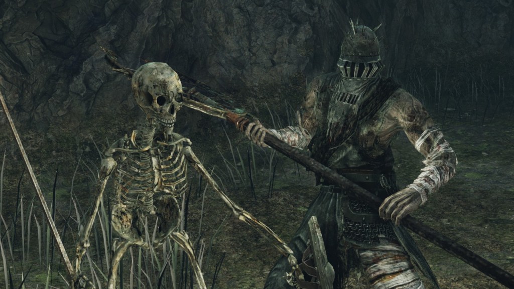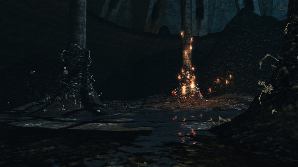 Ironic as that is, the fact that such sadism came to dominate the Undead hunts demonstrates the systematic issues with its architects. Even when they were not torturing Undead for the sake of mindless cruelty, they were still abusing their freedom away from the royal court. According to the Dark Souls II Collector’s Edition Guide, the armored skeletons encountered at the Huntsman’s Copse are former soldiers of the Old Iron King; they may carry the shields of later Drangleic foot soldiers, but those are ultimately generic. And although many had likely died combating the Undead, the guide indicates that a fair number may have been deserters. This cowardice is not that surprising when faced with what look like rotting corpses that refuse to die. But the fact that they are now among the dead — countless piled up in the Skeleton Lords’ boss room — implies the necromancers killed and reanimated these runaways to force them into playing their part. There is making an example of a renegade soldier, and then there is disregarding dignity for fellow man and enslaving him after death.