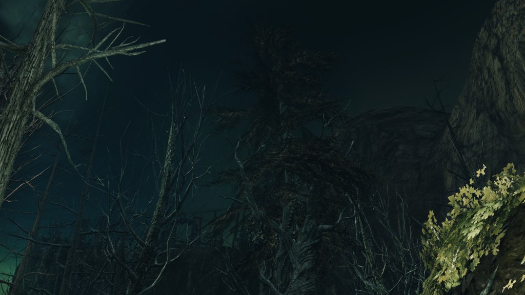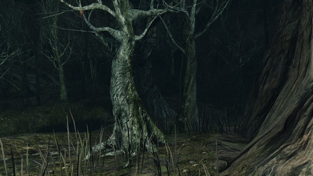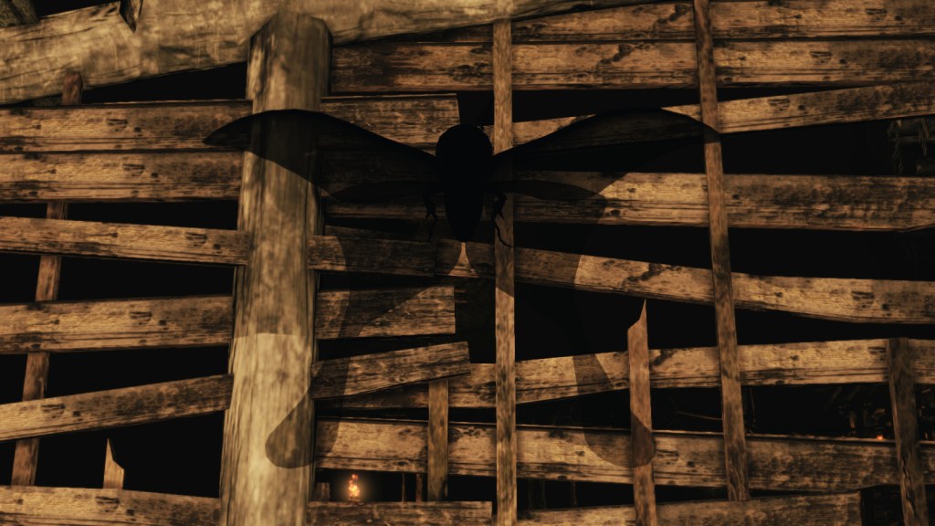 Finally, there is the presence of the “moonlit butterfly” (月下蝶) all around the copse. The name plus rumor of the creature being a product of magic rather than natural birth are obvious references to the moonlight butterflies from DS1. And while the rumor itself may be false, it is still possible for this game’s butterflies to be connected to Seath’s creations, as distant descendants if nothing else. They supposedly only appear under the full moon during winter, a desire to bask in moonlight much like the one butterfly encountered as an optional boss in DS1. One moonlit fly trapped in the Gutter has turned into a phantom silhouette in the prolonged absence of such light, so it is definitely important for them to absorb celestial magic; perhaps it is why their blood is dark blue. And although we can find at least a single butterfly in various areas across Drangleic, they are by far most common in this area, followed by Shaded Woods. Considering the DS1 butterfly boss was located in Darkroot Garden, the implication is obvious. The current butterflies derive from that boss, and its spawn originate from those two forests.