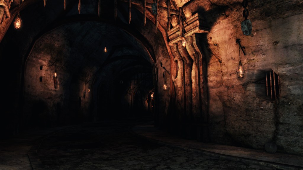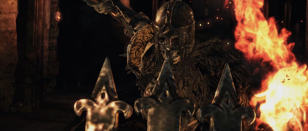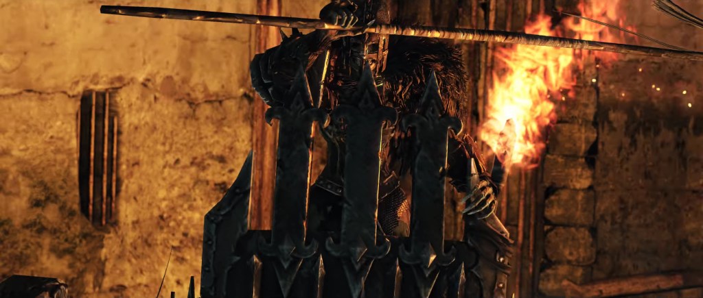 The executioners lurking in the forest wield spiked halberds or bloodied whips, the latter used for a “disgusting objective” — though not one necessarily forbidden by the gods as its English description purports. Nonetheless, it is clear that these executioners aren’t actually interested in putting down the Undead so much as extending their suffering for as long as possible. This is reinforced by the morning star found off a corpse in one of the smaller jailhouses, a notably “barbaric” weapon from DS1 designed to draw blood and thereby often preferred for inflicting pain. The same can be said for the Notched Whip or Flamberge looted elsewhere in the area, both weapons designed to filet skin and cause bleeding. Such needless cruelty extends even to their actual execution. The Bound Wooden Shield takes its plain counterpart and wraps it in chains and crude metal spikes, the description acknowledging that this dispossesses the shield of its primary function in favor of maximizing the target’s pain. Nothing better illustrates the perversion of these hunts, and it all culminated with the creation of the Executioner’s Chariot.