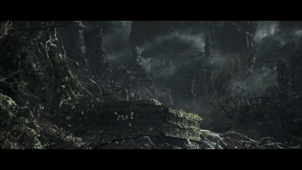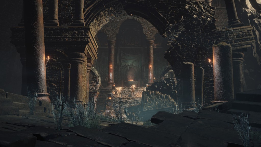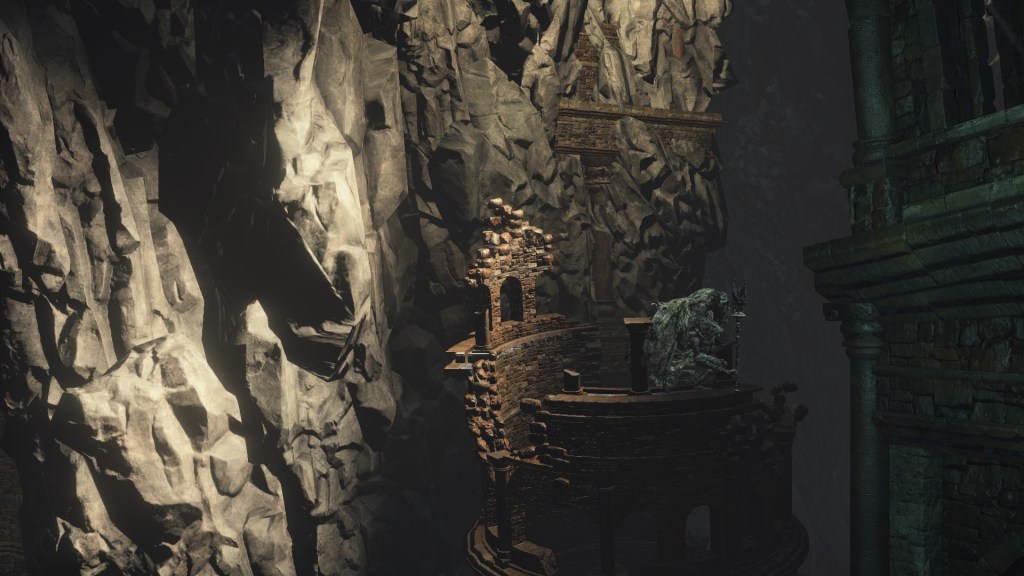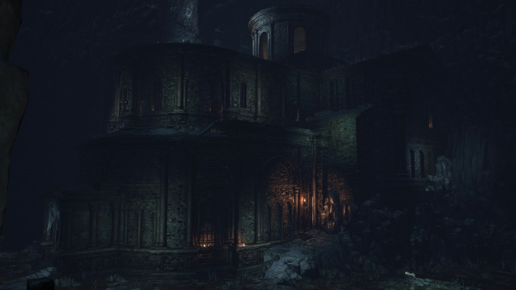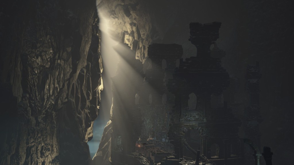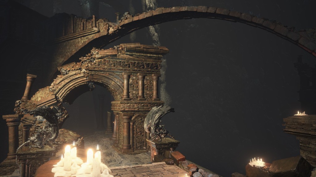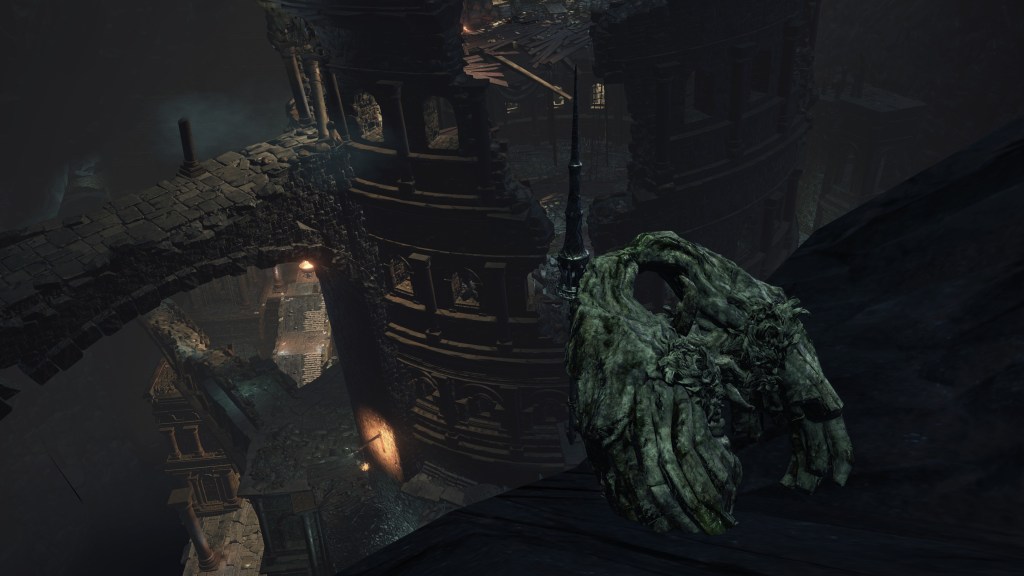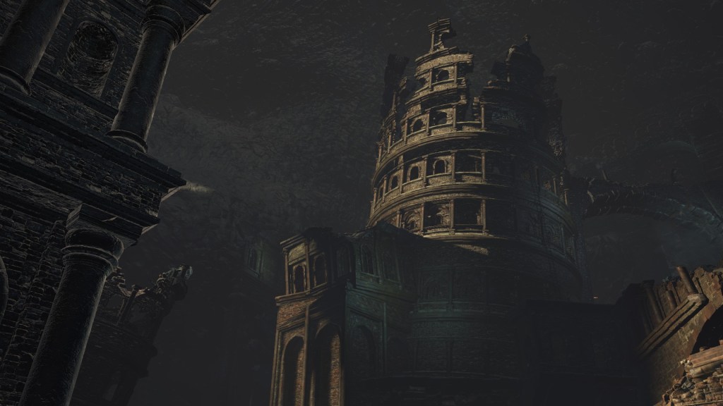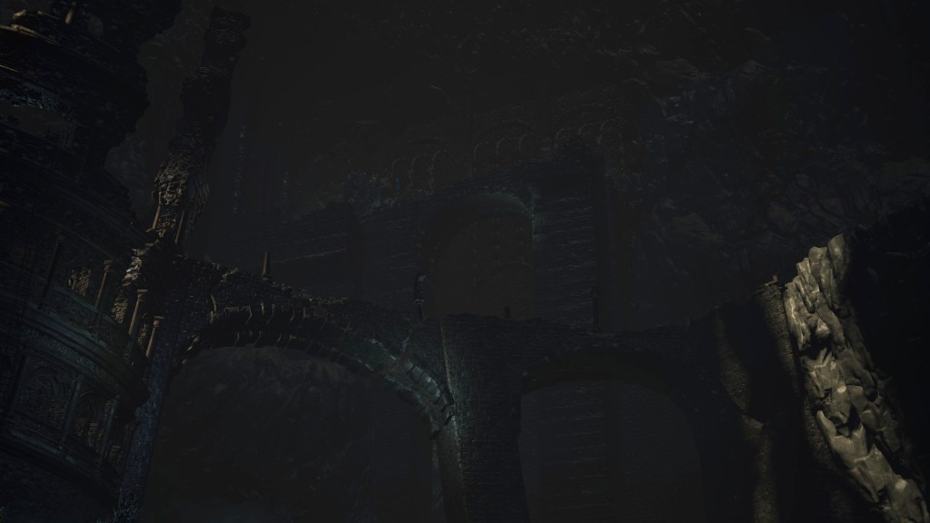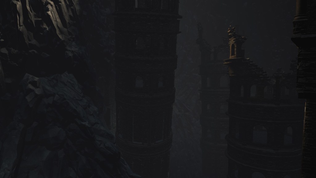 Eventually, the Profaned Capital drifted to Lothric, specifically a large pocket within the mountain which the Boreal Valley sits upon. This was clearly not the smoothest of spatial translocations given how we see parts of the architecture intersect with the cavern walls. Worse yet, the city was dropped right atop a seemingly bottomless pit, which destabilized the foundations. Almost every tower or building we see stands lopsided or falling apart, the rest seeming to have already collapsed into the abyss below. Even if the citizenry weren’t largely burned to death by the Profaned Flame, most would have surely fell to their demise along with the floor stones they stood upon — we might even have that to thank for why don’t see even more handmaids. No matter what, the Capital’s destruction was inevitable; the relocation to somewhere so deep and obscure merely prevented its invasive neighbors from looting the spoils. However, things changed when a certain Pontiff came to town.