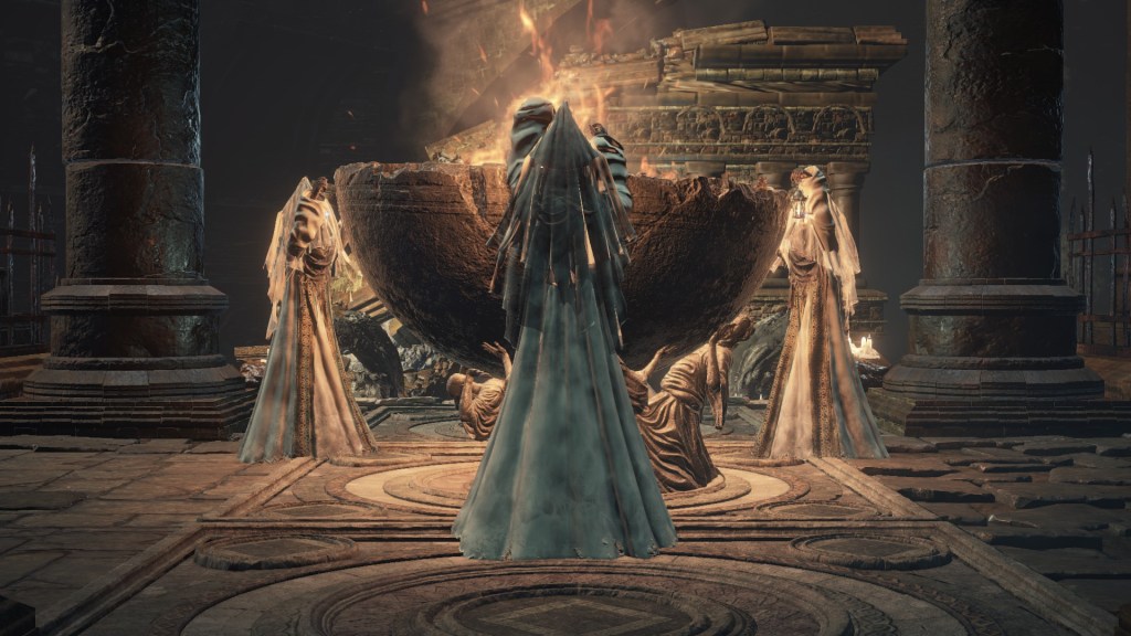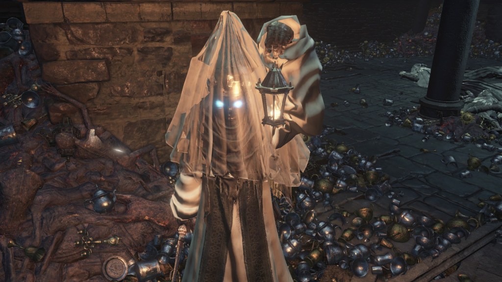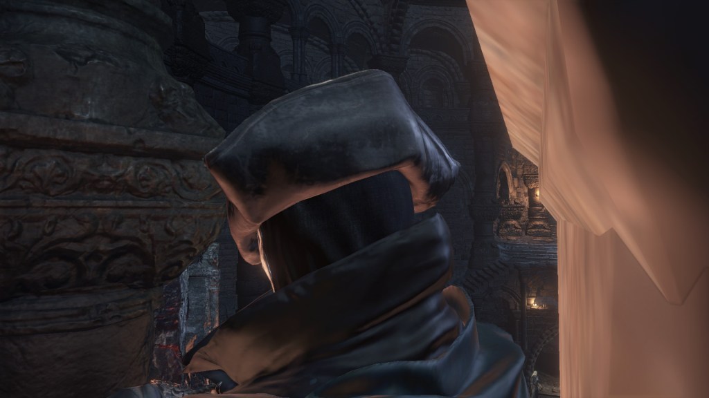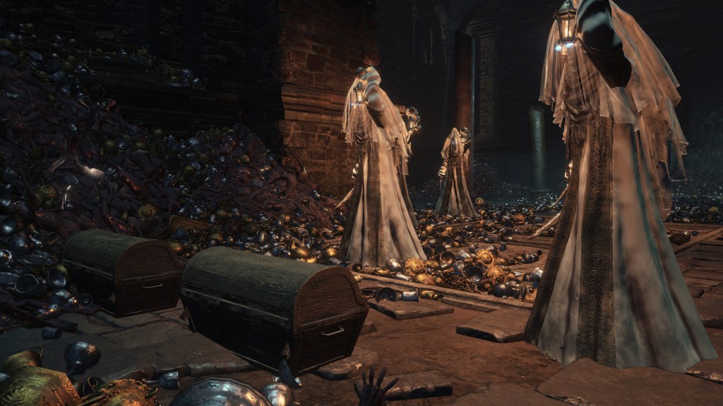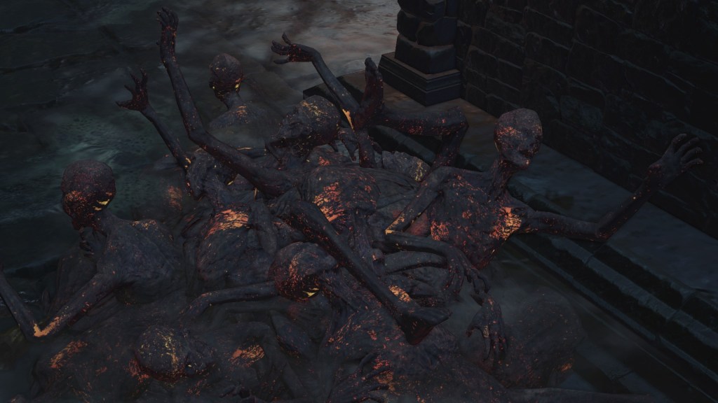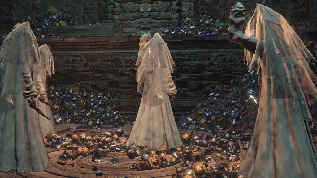The flames weren’t necessarily a death sentence for everyone present either. Leonhard evidently grew up after suffering pretty heavily from the burns, while Eamon and his grotesque family appearing to have been left completely untouched. A fair number of the handmaids similarly survived, and this cannot be credited to undeath. The description for the Jailer’s Key Ring mentions Irithyll Dungeon imprisoning primarily Hollows, and the only actual Hollows we can encounter there are the Undead Settlement’s cage spiders and morticians, reskinned to wear varying degrees of the handmaids’ attire. Clearly, they are intended to be those handmaids, the only difference being their maroon robes, black veils, and sleeves tucked in long gloves — all of which can be chalked up to FromSoftware tailoring each to the area’s intended atmosphere. This implies that a good portion, if not all, of the handmaids did turn Undead at some point. However, their exposed skin reveals no signs of burns like the deceased populace. In short, they died of other causes over the ensuing decades, not the cataclysmic rain of fire.