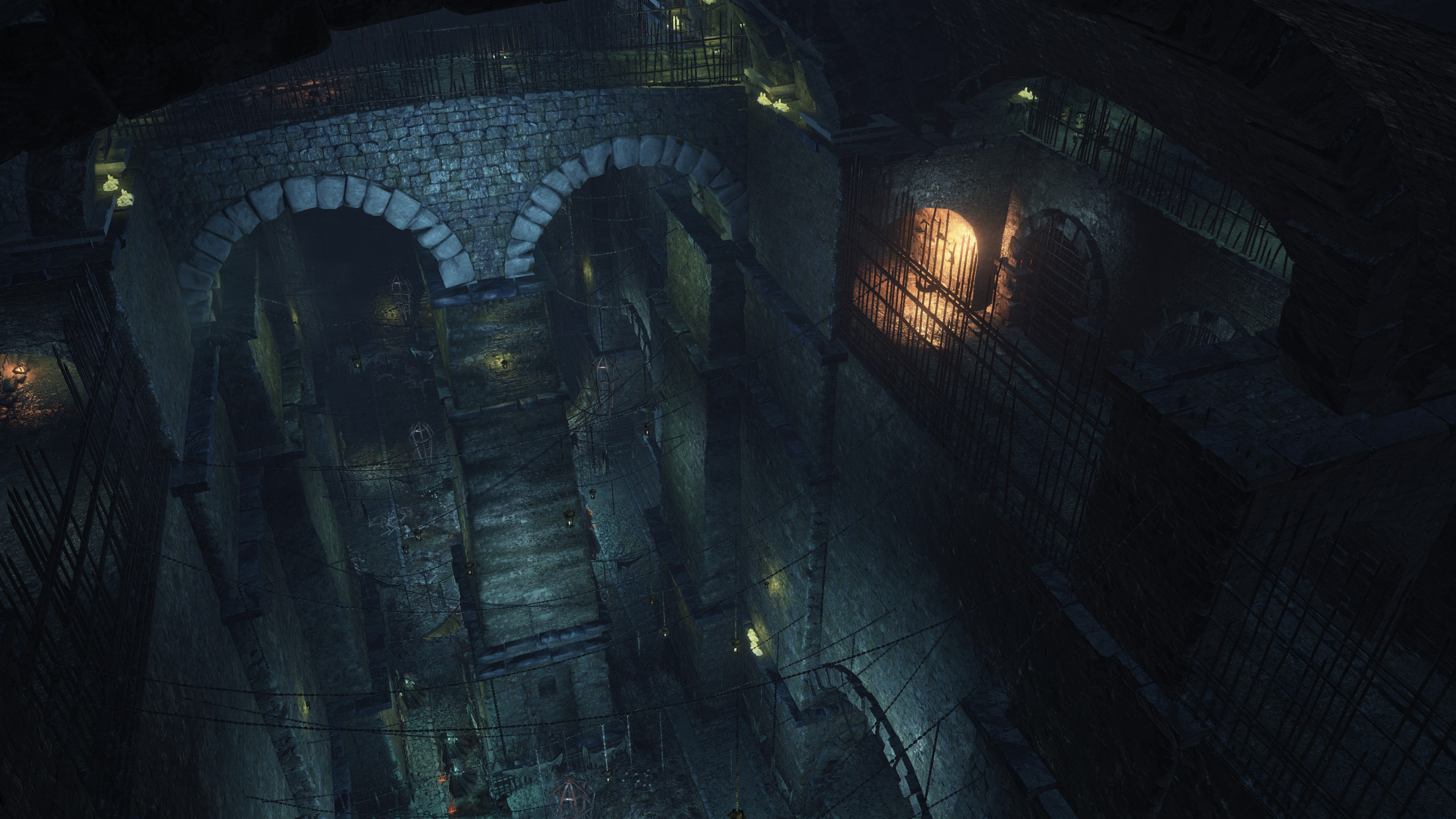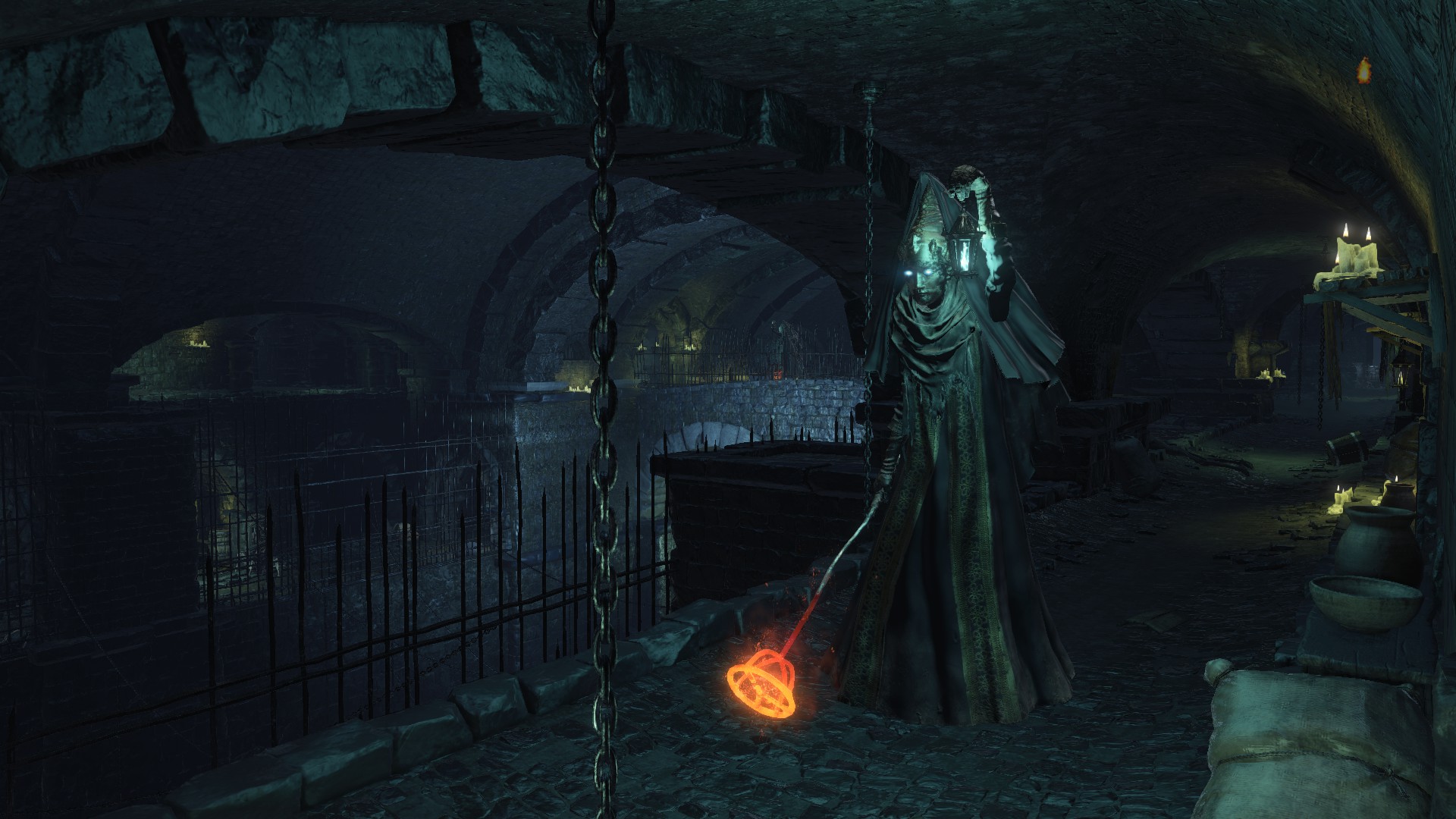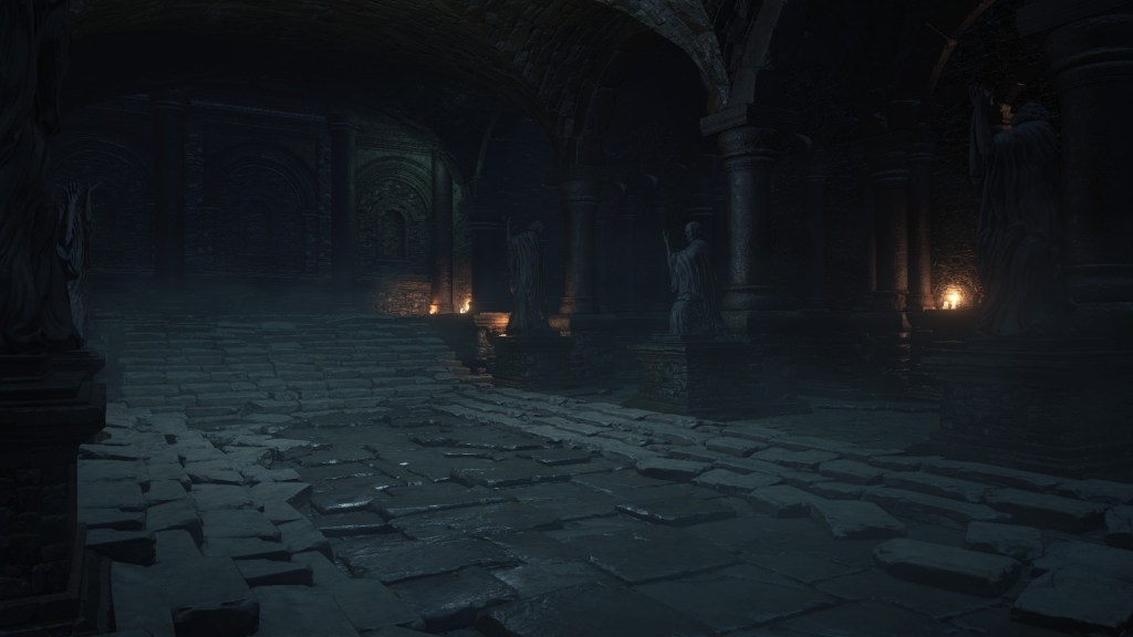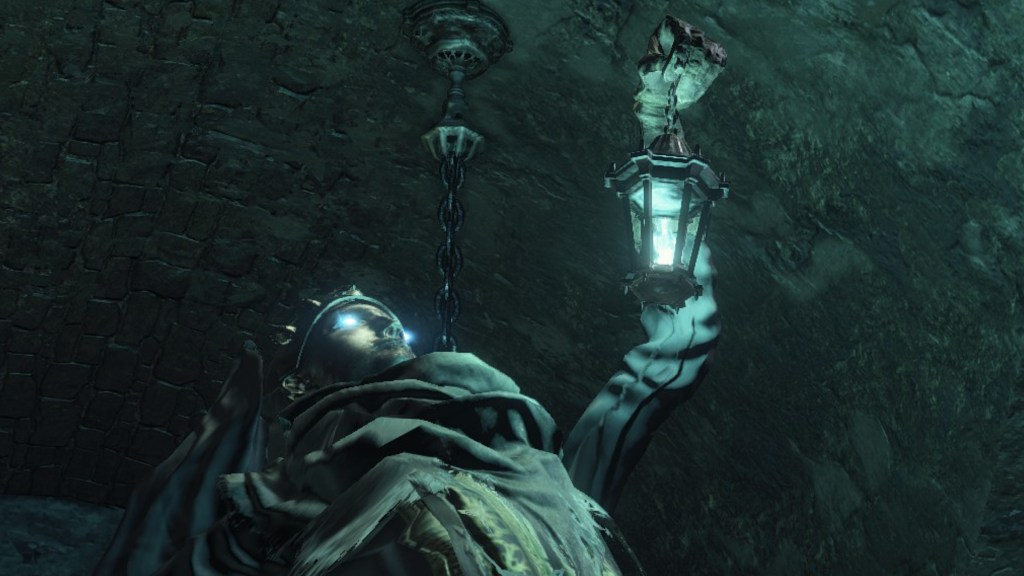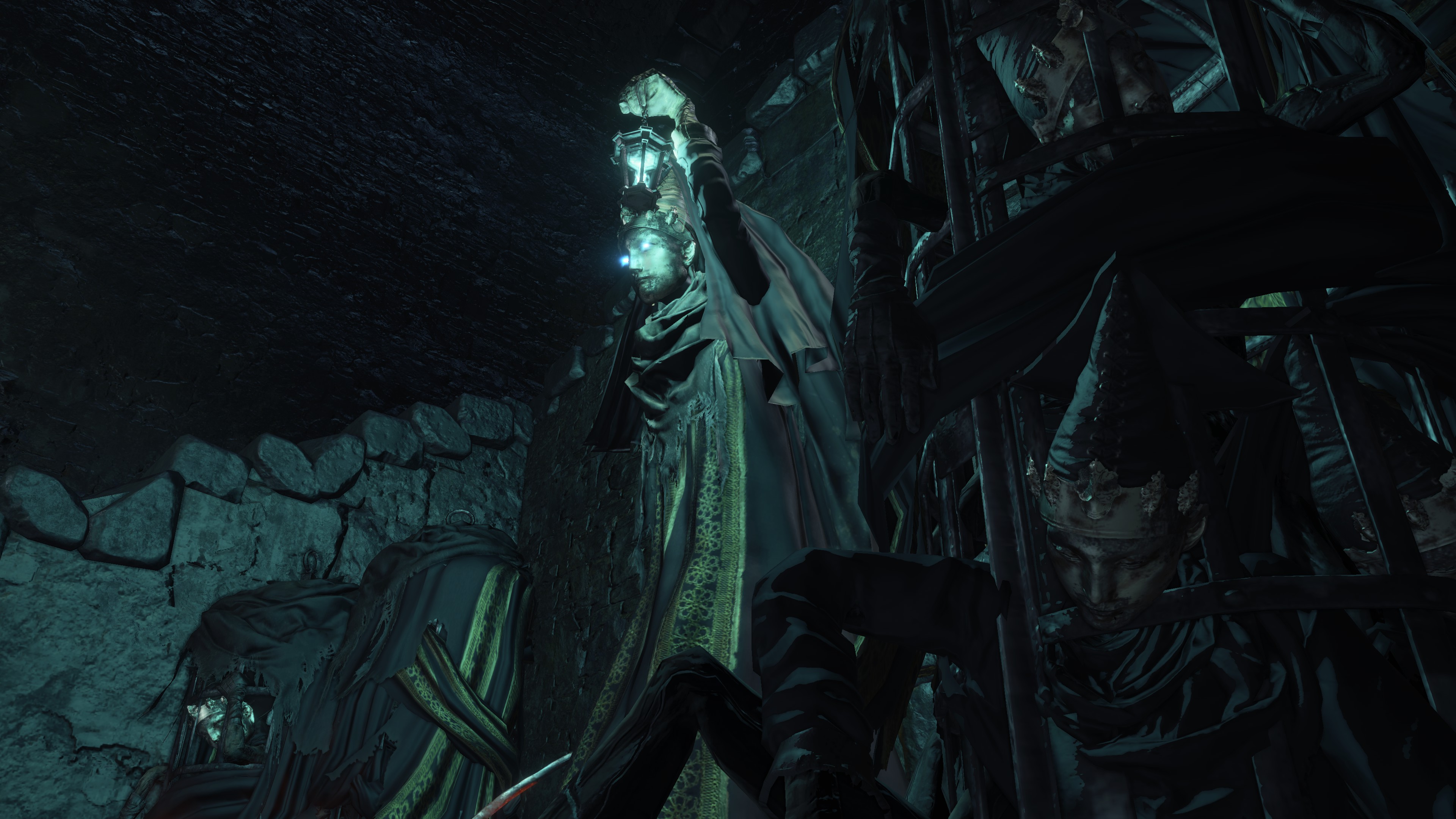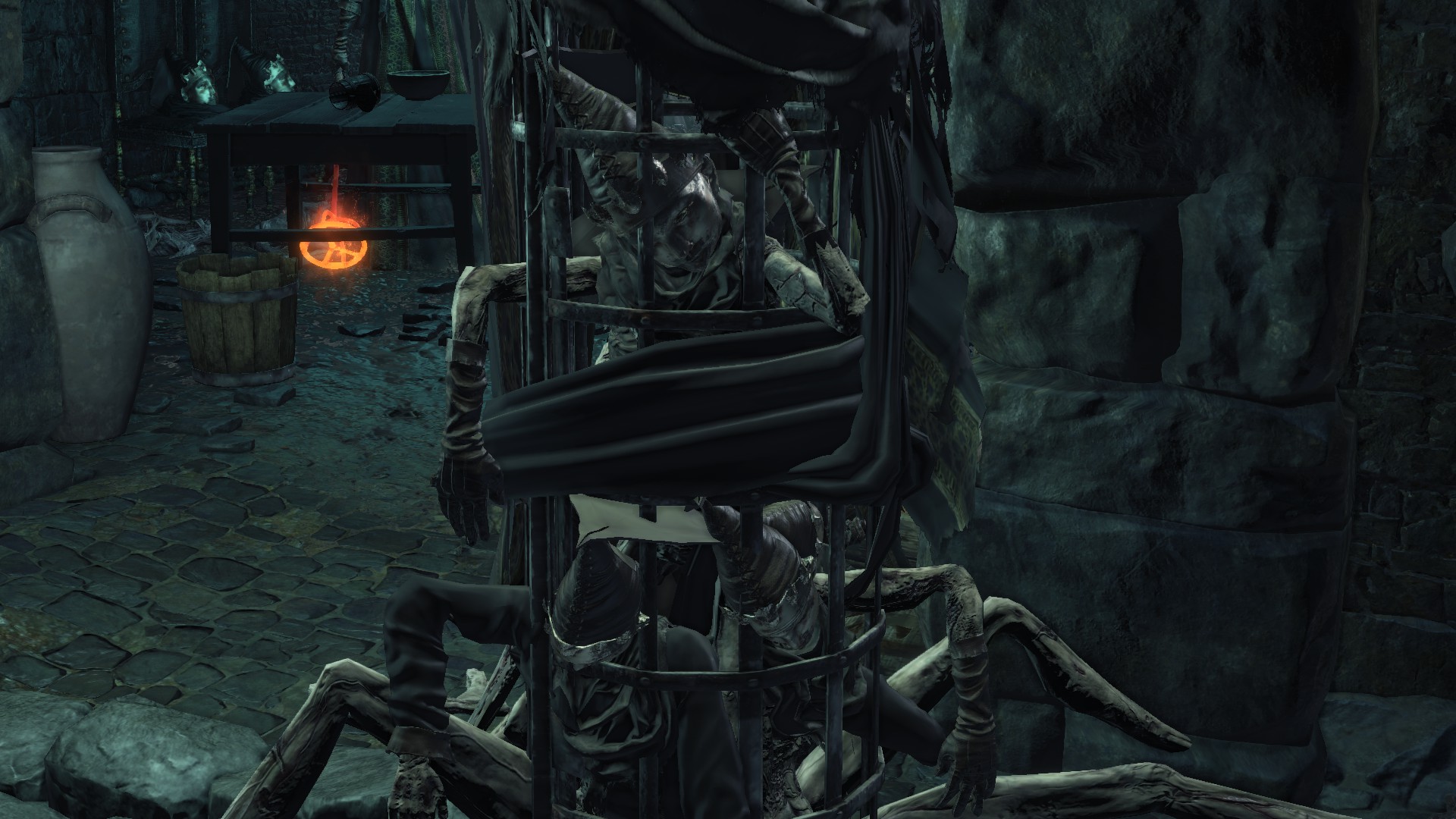 The jailers patrolling the dungeon are the captured handmaids, or rather were before agreeing to serve Irithyll’s pope, swapping out the Profaned Flame in their lanterns for magic blue fire. Evidently, he offered some among them freedom from confinement in exchange for their loyalty as prison wardens, to which they agreed — an obvious callback to how the jailers of Latria’s Prison of Hope gained their position in Demon’s Souls; they even patrol similar bifurcated labyrinthian layouts. This pragmatic approach to his personnel problem extended to their general duties. Adorning the dungeon above our heads are statues of women in robes not unlike those worn by the sorcerers in the Capital’s effigies. This is the only place in all of Irithyllian architecture where the typical statues of Gwyndolin aren’t employed instead, which speaks to the level of independence the former handmaids have managing this facility. So long as Sulyvahn got what he wanted, they were free to do as they wish. It should come as no surprise, then, that the jailers used their new position of power as an act two for their sadism.