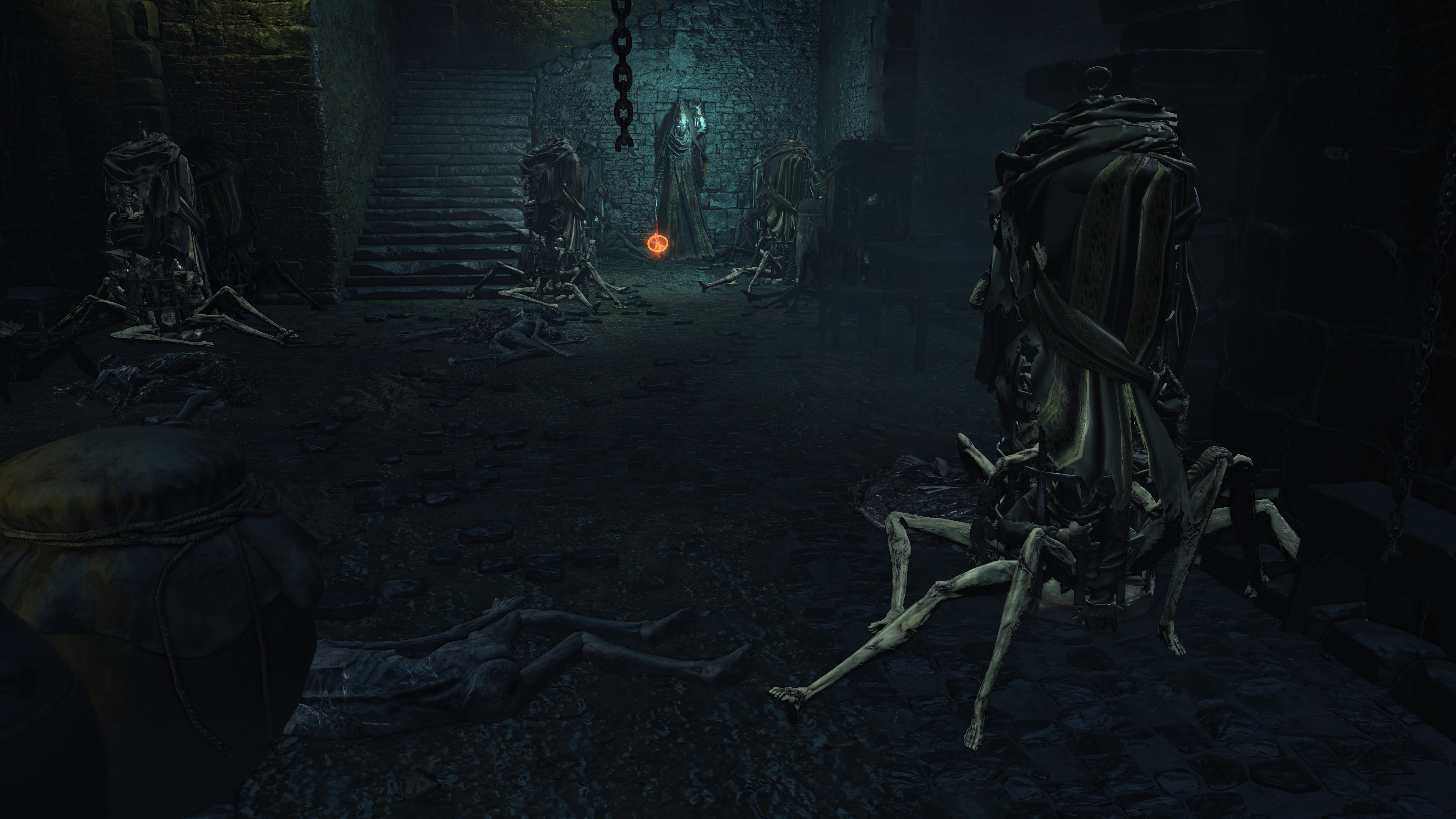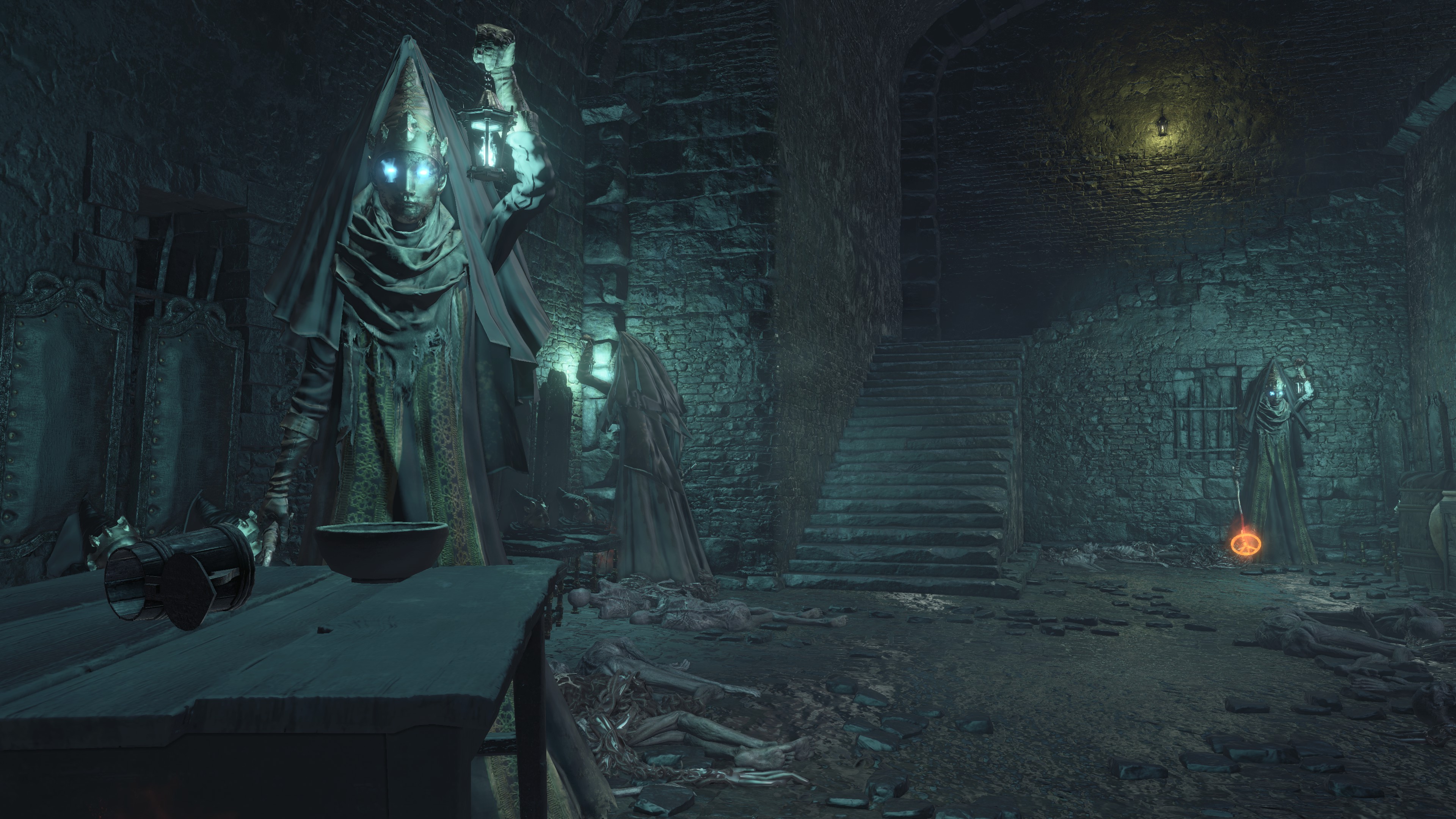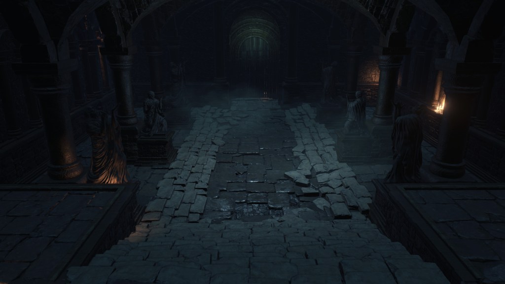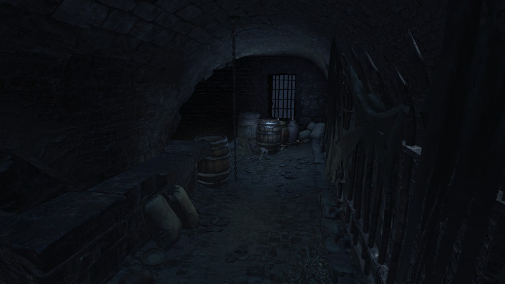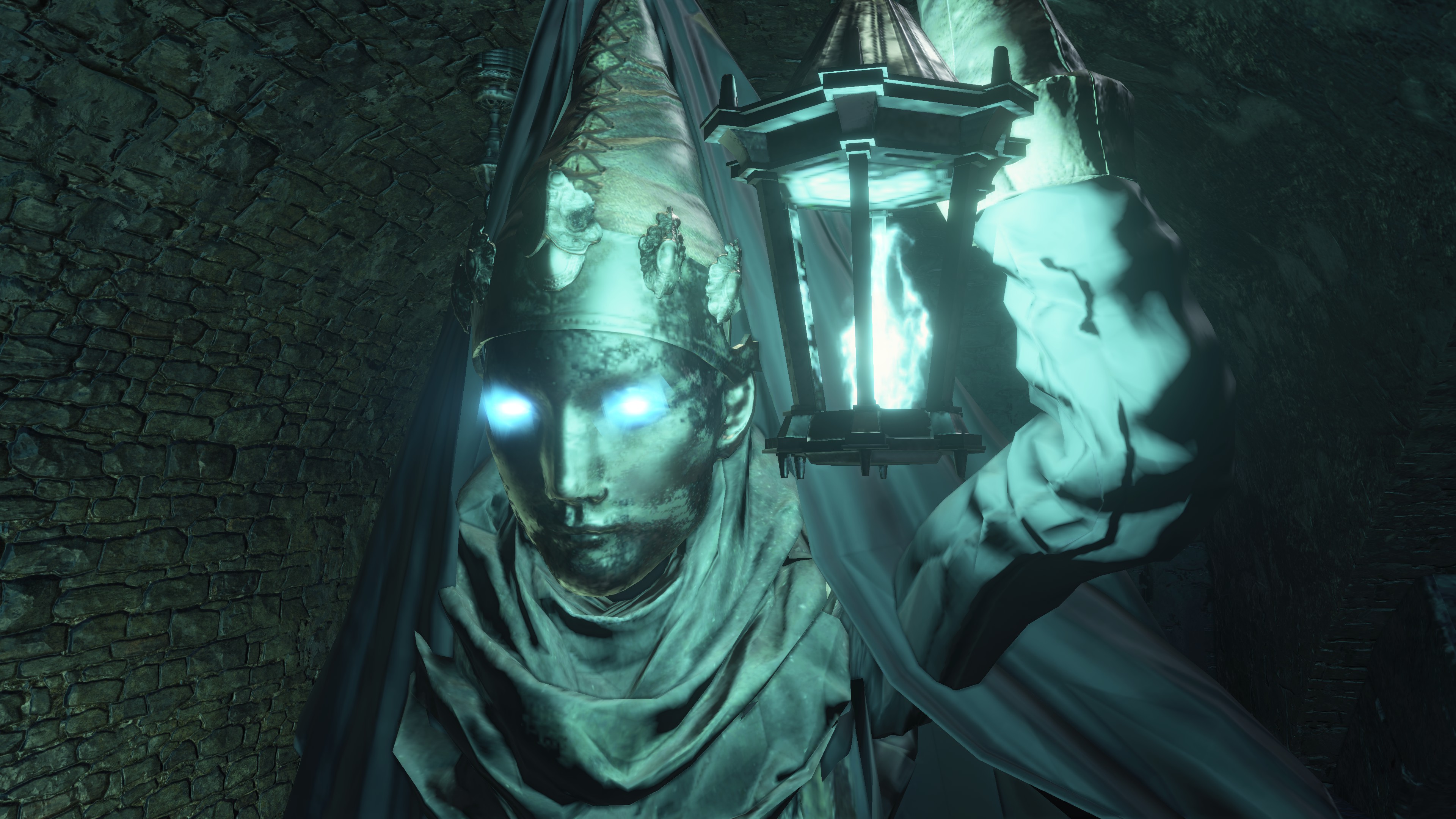 The jailers patrolling the dungeon are the captured handmaids, or rather were before agreeing to serve Irithyll’s pope, swapping out the Profaned Flame in their lanterns for magic blue fire. Evidently, he offered some among them freedom from confinement in exchange for their loyalty as prison wardens, to which they agreed — an obvious callback to how the jailers of Latria’s Prison of Hope gained their position in Demon’s Souls; they even patrol similar bifurcated labyrinthian layouts. This pragmatic approach to his personnel problem extended to their general duties. Adorning the dungeon above our heads are statues of women in robes not unlike those worn by the sorcerers in the Capital’s effigies. This is the only place in all of Irithyllian architecture where the typical statues of Gwyndolin aren’t employed instead, which speaks to the level of independence the former handmaids have managing this facility. So long as Sulyvahn got what he wanted, they were free to do as they wish. It should come as no surprise, then, that the jailers used their new position of power as an act two for their sadism.