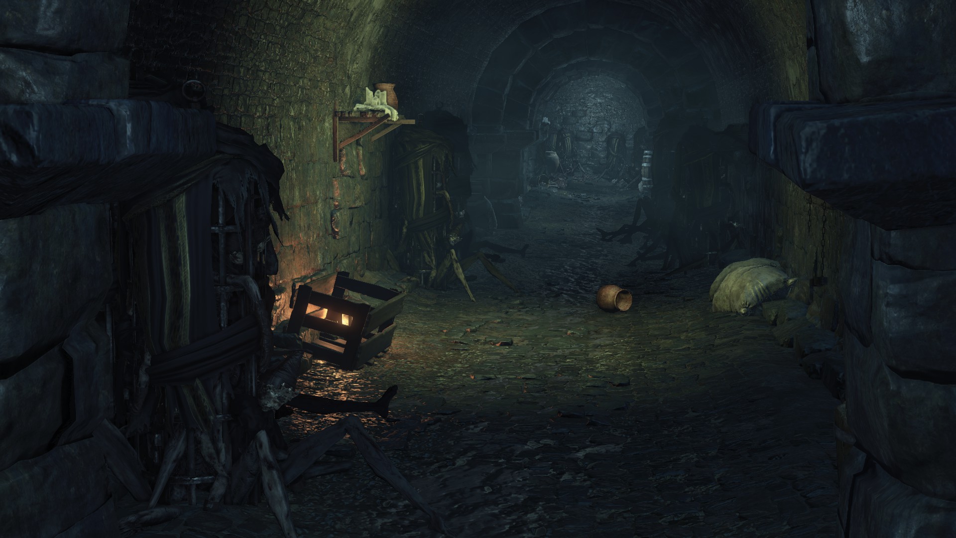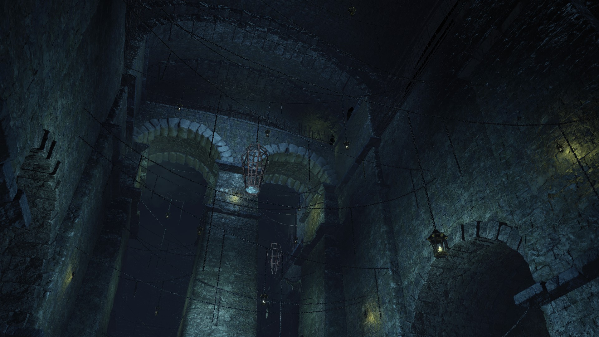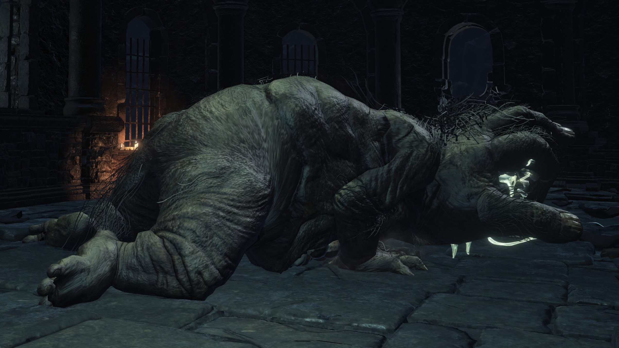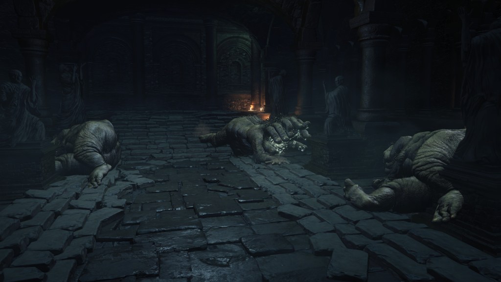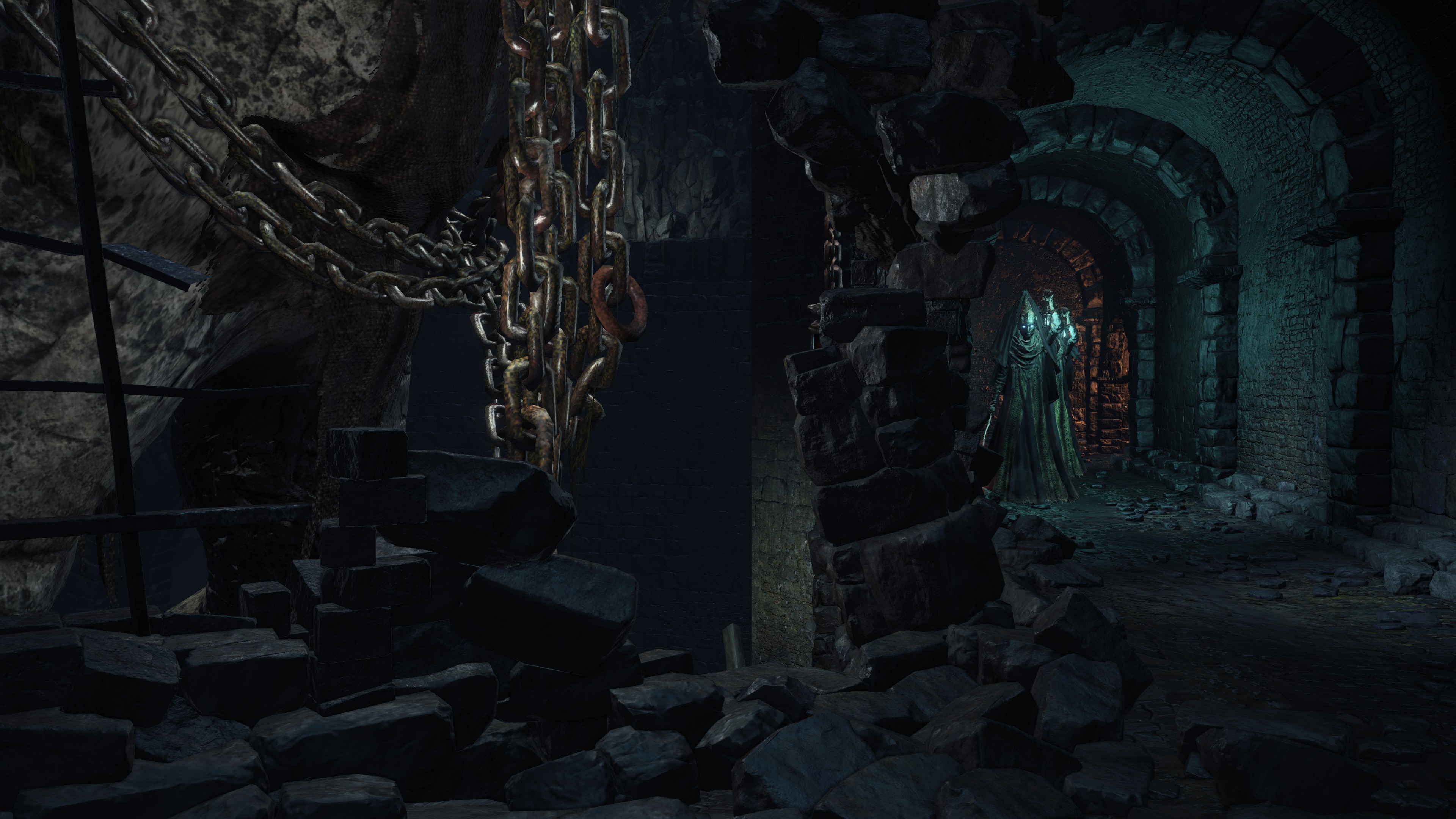 The jailers patrolling the dungeon are the captured handmaids, or rather were before agreeing to serve Irithyll’s pope, swapping out the Profaned Flame in their lanterns for magic blue fire. Evidently, he offered some among them freedom from confinement in exchange for their loyalty as prison wardens, to which they agreed — an obvious callback to how the jailers of Latria’s Prison of Hope gained their position in Demon’s Souls; they even patrol similar bifurcated labyrinthian layouts. This pragmatic approach to his personnel problem extended to their general duties. Adorning the dungeon above our heads are statues of women in robes not unlike those worn by the sorcerers in the Capital’s effigies. This is the only place in all of Irithyllian architecture where the typical statues of Gwyndolin aren’t employed instead, which speaks to the level of independence the former handmaids have managing this facility. So long as Sulyvahn got what he wanted, they were free to do as they wish. It should come as no surprise, then, that the jailers used their new position of power as an act two for their sadism.